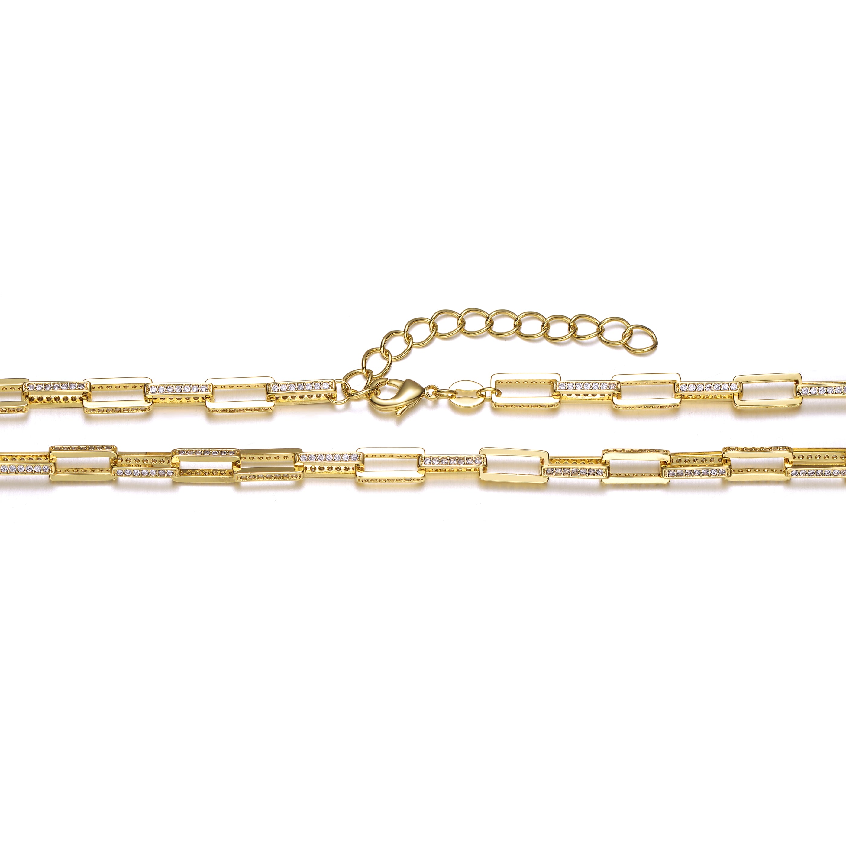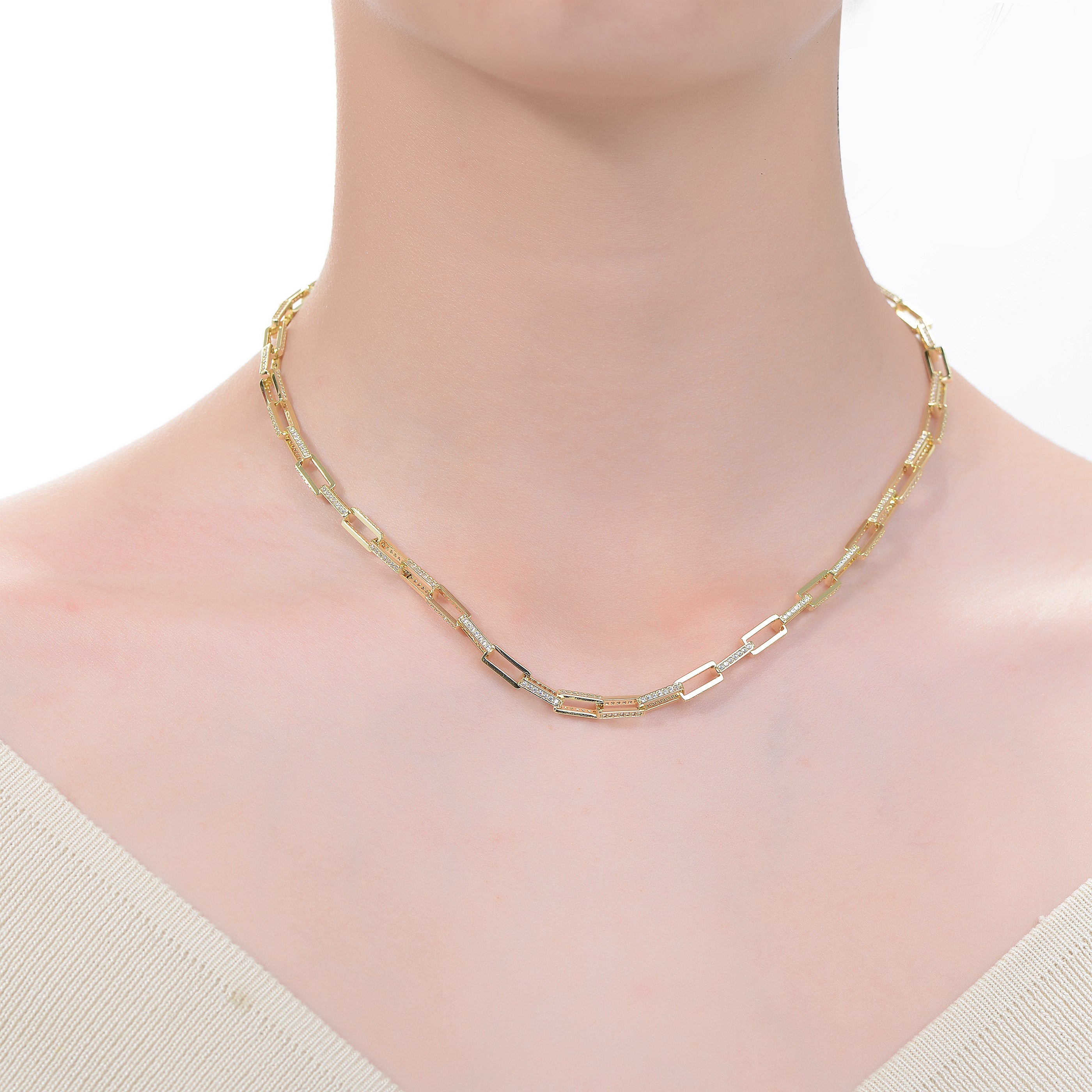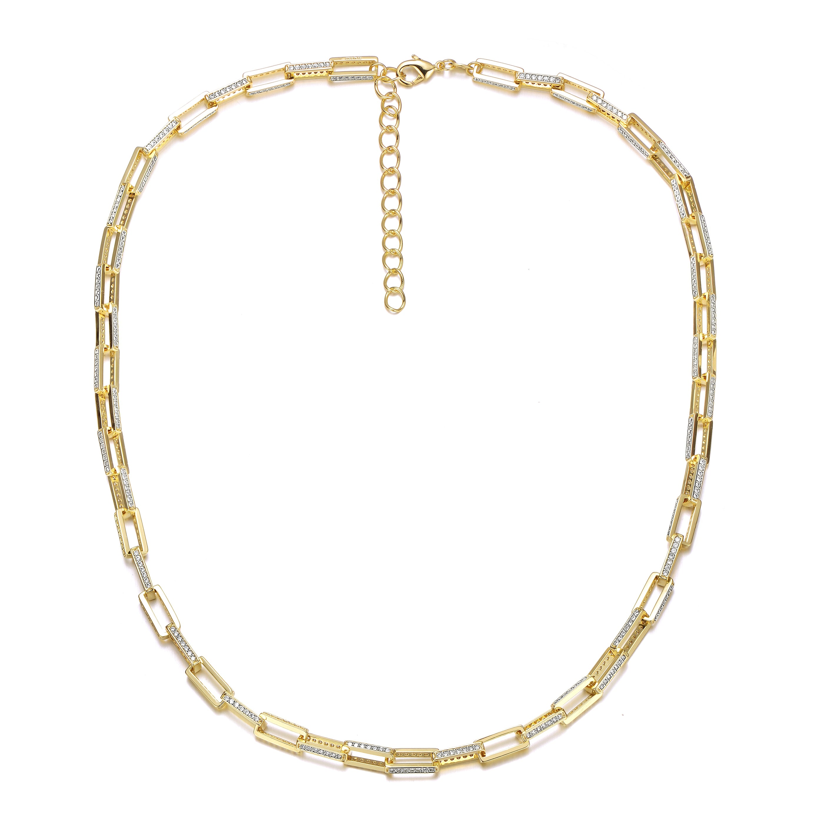 Stylish 14K Gold Plated Necklace. This stylish item features interesting minimalistic design. It is made out of rectangle paper clip link chain, accented laterally with small clear round cubic zirconia stones. Crafted with 14K Gold Plating and secure with a lobster claw closure. Perfect piece of jewelry for all combinations. These also make a sensational gift for a special birthday or occasion.