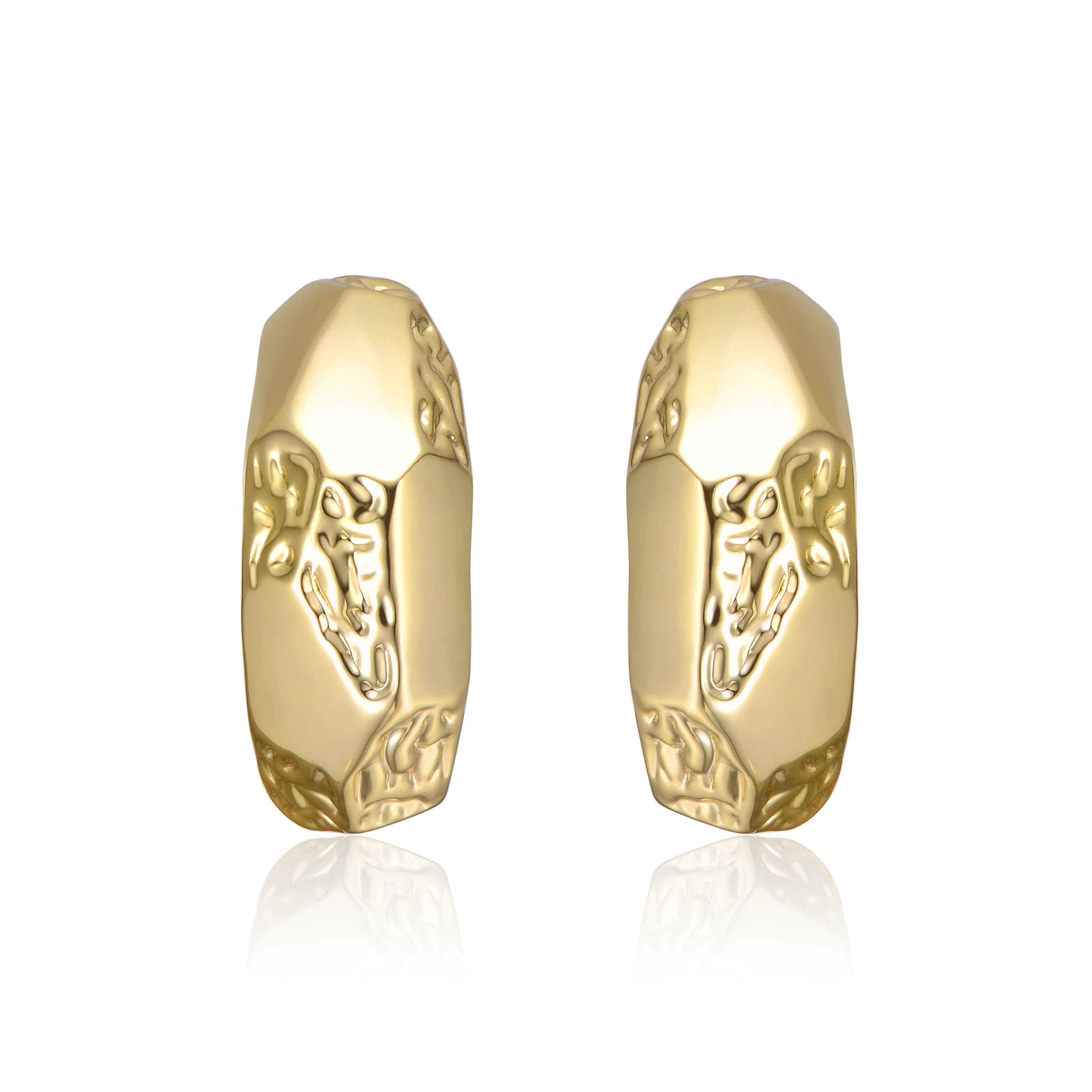 14k Gold Plated Geometric Gold Nugget C-Hoop Earrings. Add these 14k gold plated c-hoops to your other stacked jewelry looks, giving any style an upgraded modern version of your favorite plus the latest trends. A textured hammered finish interplays with a bright shine, with each unique detail set in geometric panels for a rustic meets contemporary elegance. Butterfly backs keep these tubular, lightweight open hoops in place, making them an effortless choice for any time.