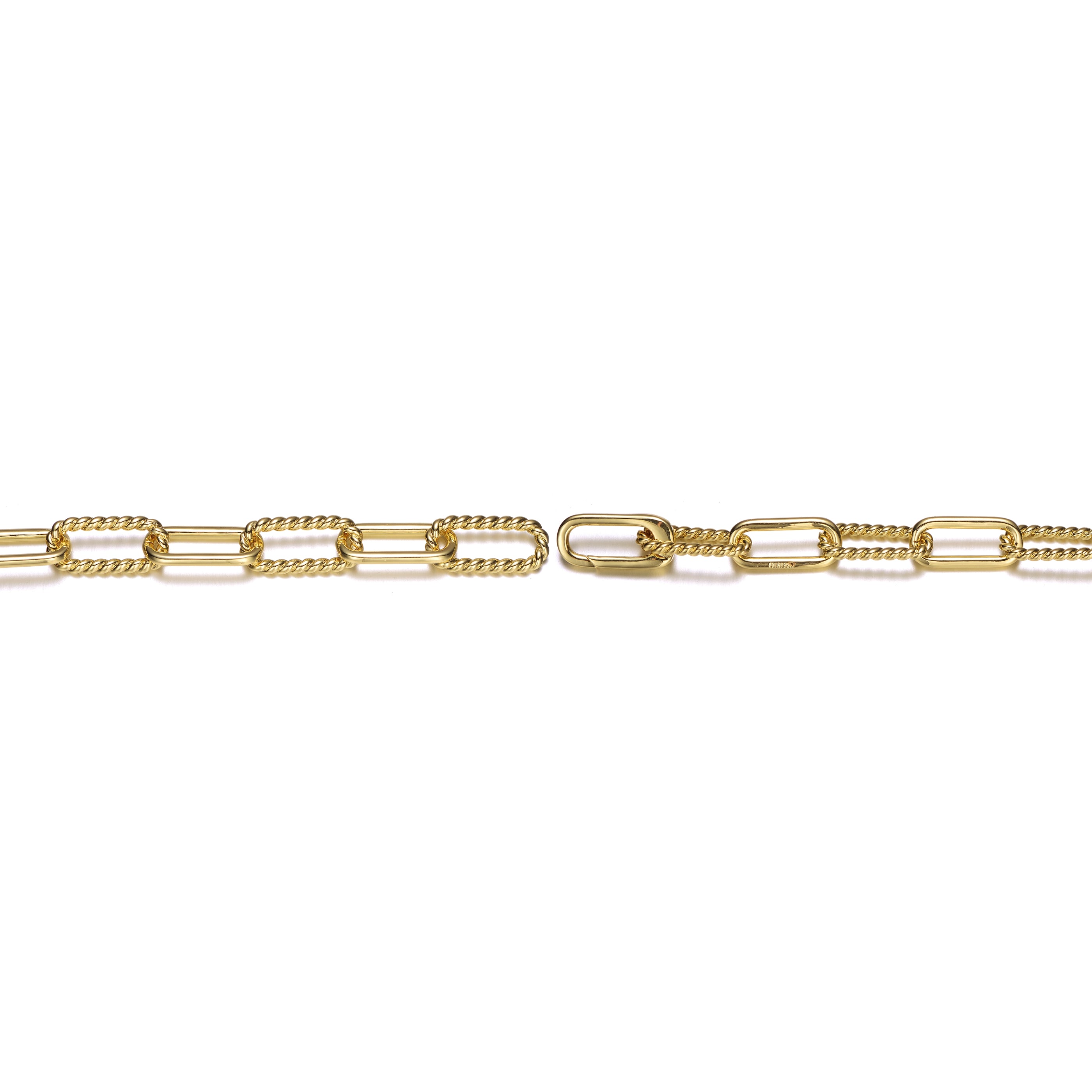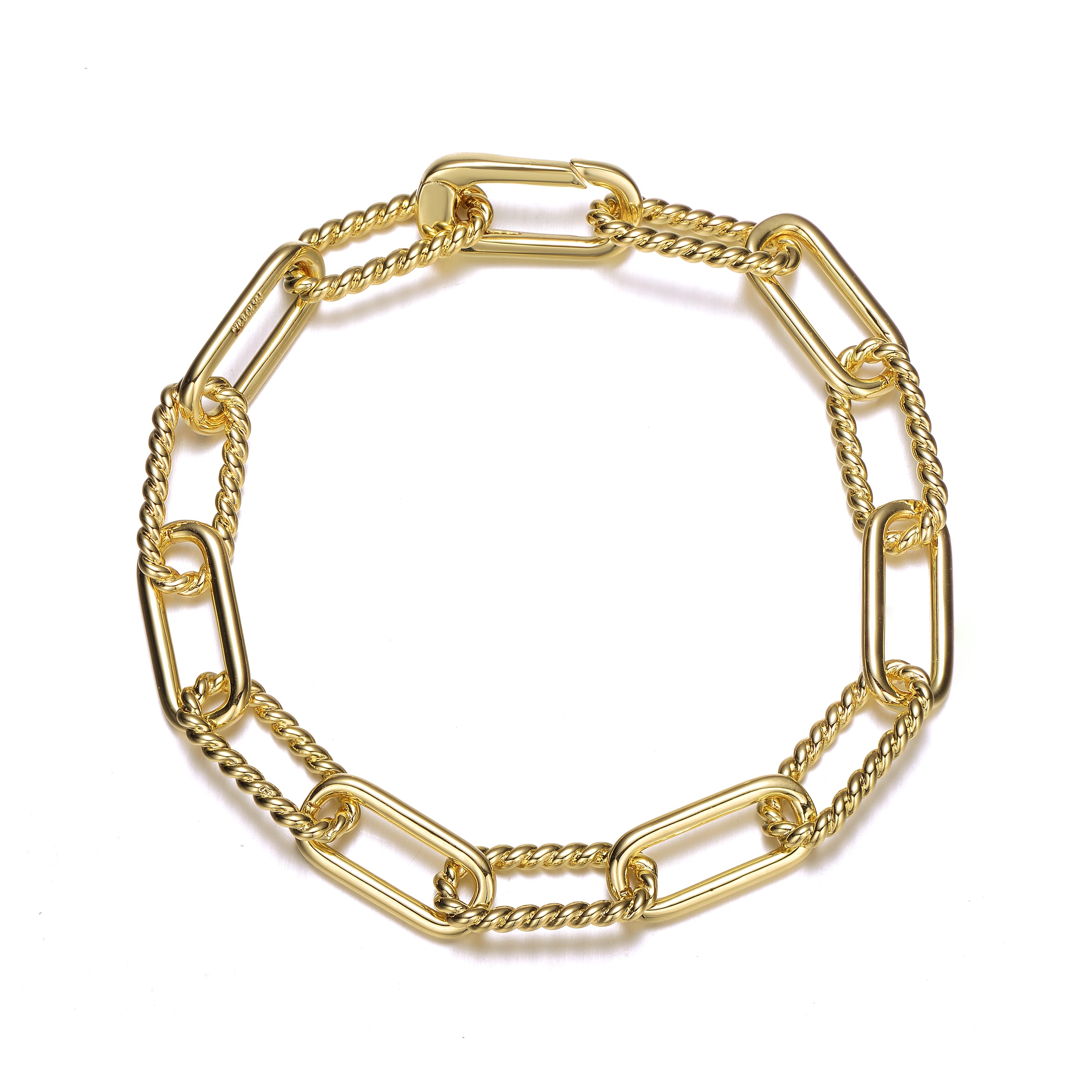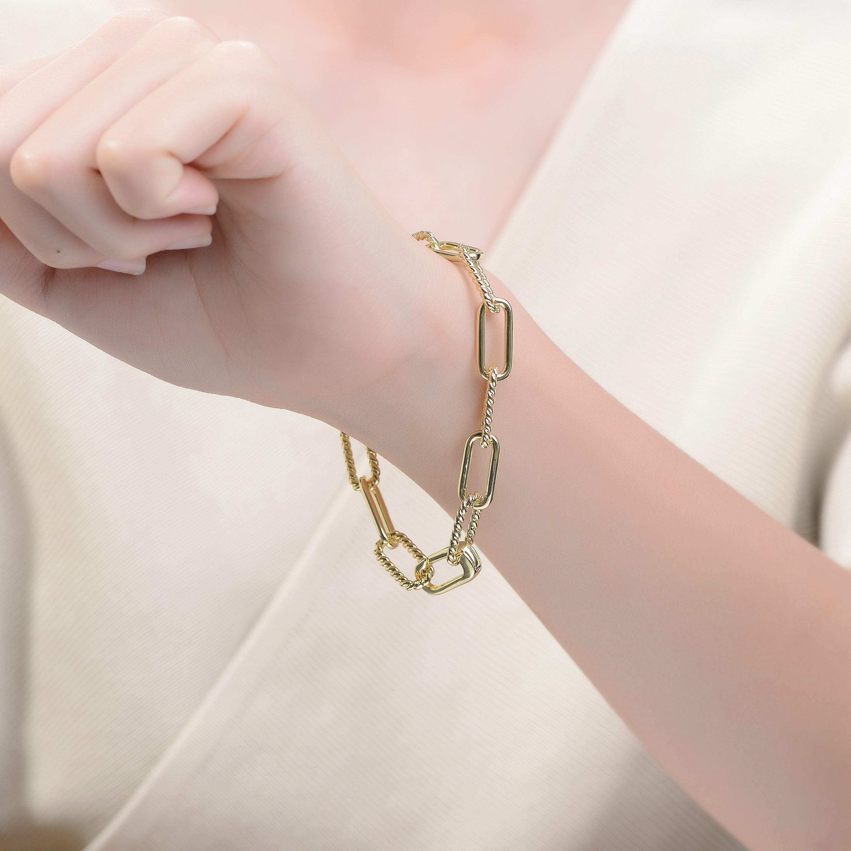 Classy 14K Gold Plated Paperclip Chain Bracelet. This bracelet features a sophisticated design fashioned from two types of paperclip chains: one made out of solid metal and the other one with wavy texture, changing alternately. Crafted with 14K Gold Plating and it is secured with spring lock closure.