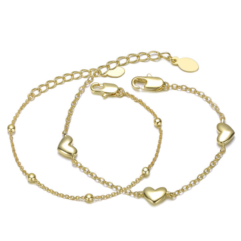 Add a touch of elegance with this 14K gold-plated station bracelet set. Featuring two beautifully crafted bracelets, each adorned with delicate chain links, small gold beads, and charming heart-shaped accents. The adjustable length with lobster claw clasps ensures a comfortable fit. Designed to shine effortlessly, this stylish set complements any outfit, making it perfect for everyday wear or special occasions. A refined addition to your jewelry collection.