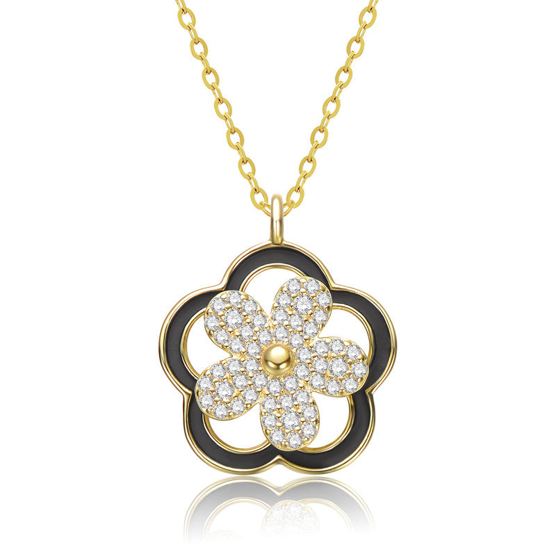 14K Gold Plated with Clear Cubic Zirconia & Black Enamel Flower Design Drop Pendant Necklace