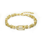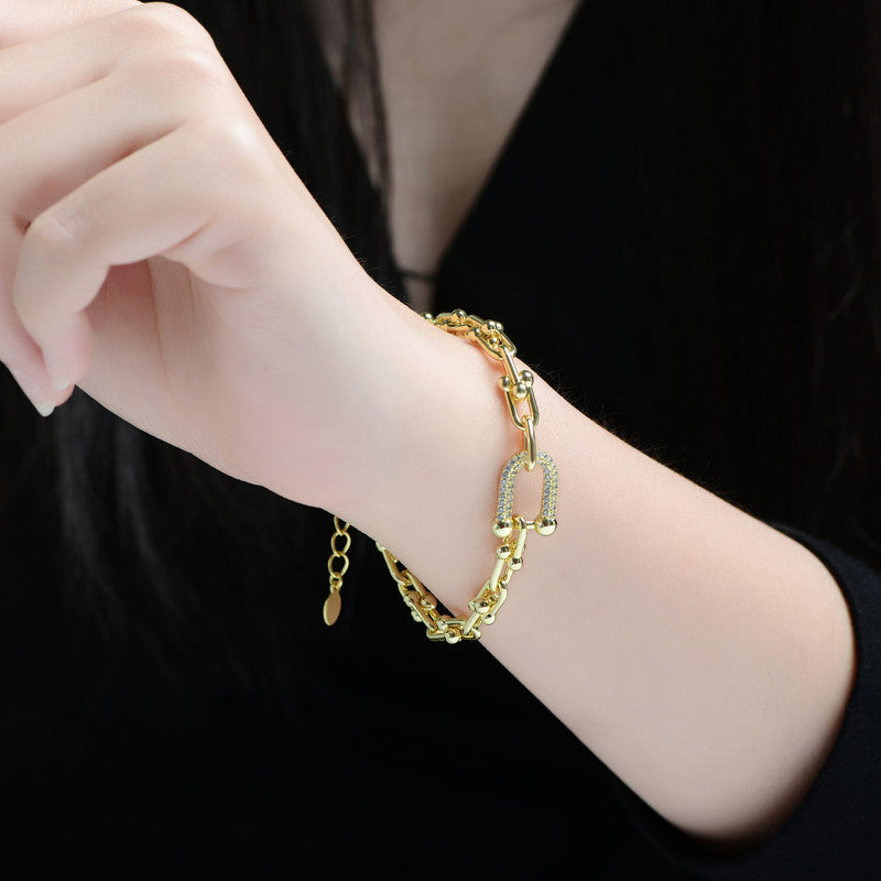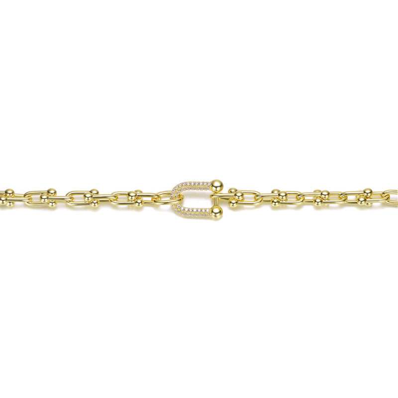 This stunning bracelet exudes elegance with its 14K gold-plated finish, offering a radiant shine and luxurious appeal. The design features a striking horseshoe-shaped link adorned with brilliant clear cubic zirconia stones, adding a touch of sparkle and sophistication. Its delicate yet durable chain provides a comfortable fit, making it perfect for everyday wear or special occasions. Whether worn alone or stacked with other accessories, this bracelet is a timeless symbol of style and grace.