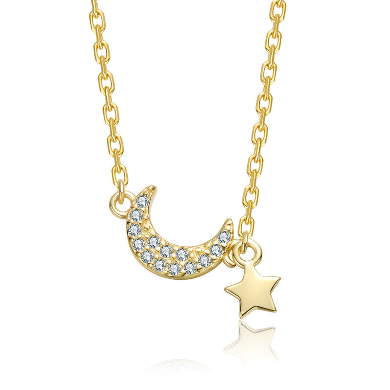 Elevate your style with this elegant 14K gold-plated Moon & Star Pendant Necklace. The crescent moon, adorned with dazzling clear cubic zirconia stones, sparkles with a celestial glow, while the gold-plated star adds a touch of understated charm. Suspended from a delicate gold-plated chain, this timeless accessory beautifully combines sophistication and cosmic allure, making it perfect for both everyday wear and special occasions. Let this necklace be your guide to effortless elegance and a hint of the universe's magic.
