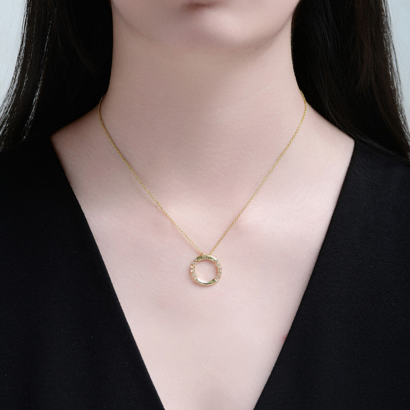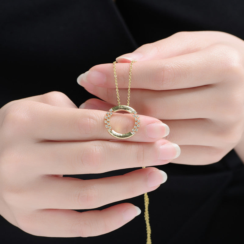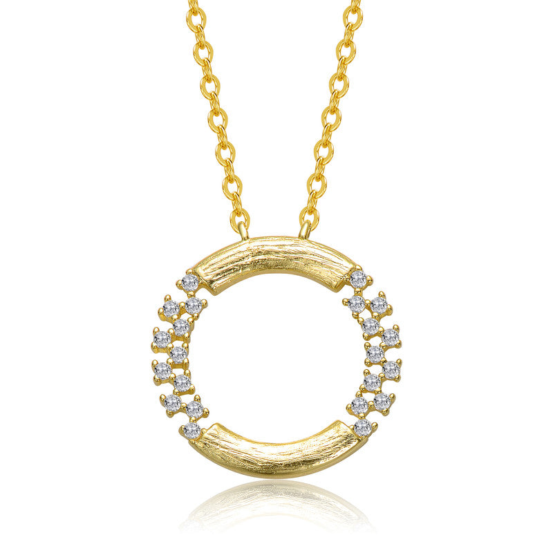 Add a touch of brilliance to your look with this 14K gold-plated round pendant necklace, adorned with sparkling clear cubic zirconia stones. The elegantly textured gold finish enhances the sophisticated design, while the shimmering zirconia accents bring a captivating radiance. Suspended from a delicate 14K gold plating chain, this pendant is versatile enough for both everyday wear and special occasions. A refined statement piece that exudes charm and timeless elegance.
