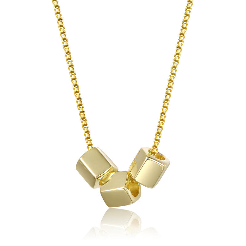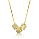 Add a touch of modern sophistication to your style with this 14K Gold Plated cube-shaped Beaded Necklace. Featuring a sleek gold chain with a box-like pattern, this elegant accessory is adorned with three polished cube-shaped beads evenly spaced along the chain. The smooth, minimalist design combined with the radiant gold finish creates a versatile piece that's perfect for both casual and formal occasions. Elevate your jewelry collection with this timeless and chic necklace.