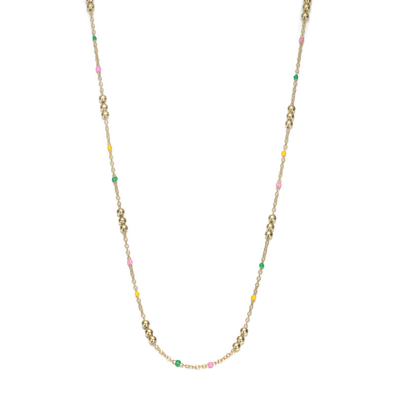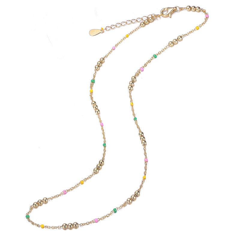 Add a touch of elegance to your jewelry collection with this exquisite 14K gold plating necklace, adorned with colorful beads and intricate twisted accents. Featuring vibrant hues of green, pink, and yellow, this beautifully designed piece strikes the perfect balance between modern style and timeless sophistication. The delicate 14K gold plating chain with twisted elements enhances its refined appeal, making it a versatile accessory for casual outings or special occasions. Elevate your look with this graceful and unique necklace.