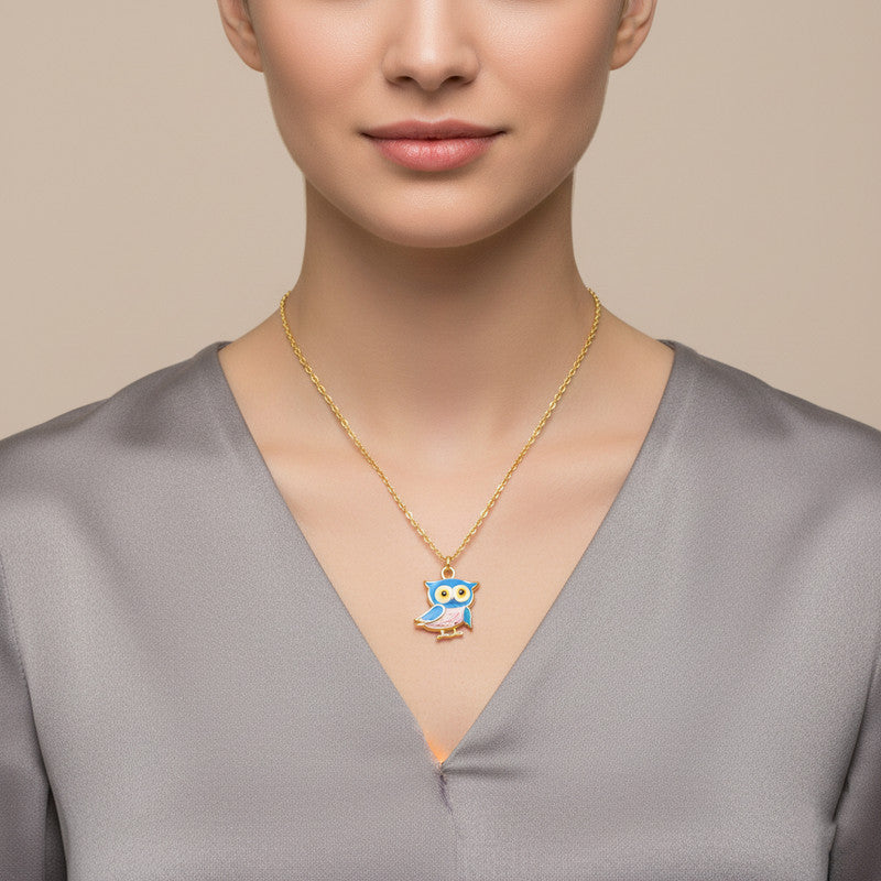 Add a touch of charm to your style with this 14K gold plating chain Pendant, featuring a colorful owl pendant. The owl’s striking design combines a blue head and wings, golden accents, bright yellow eyes, and a playful pink body, creating a bold and lively look. With intricate detailing and vibrant hues, this accessory effortlessly blends elegance and fun, making it a perfect statement piece for any outfit. Embrace the enchantment of this whimsical design!