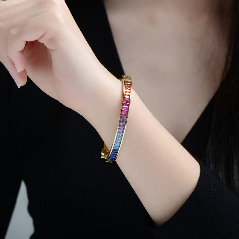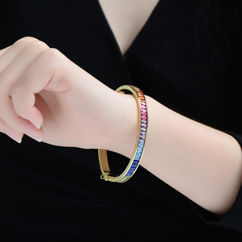 This stunning 14K gold-plated bangle bracelet is a vibrant celebration of color and elegance. Adorned with a row of shimmering multi-colored cubic zirconia stones in a mesmerizing gradient pattern, it effortlessly transitions from deep blue to warm red, creating an eye-catching display of brilliance. The sleek and sophisticated 14K gold-plated setting enhances the radiance of each carefully cut stone, adding a touch of luxury to any outfit. Designed with a secure clasp for comfortable wear, this bracelet is perfect for those who appreciate bold yet refined jewelry that makes a statement in every gesture.