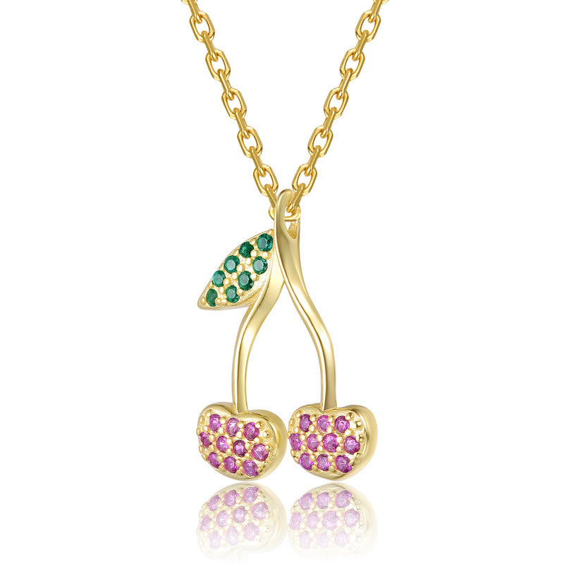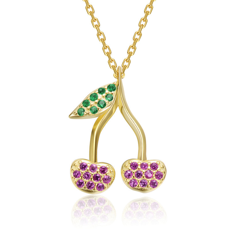 This exquisite cherry blossom necklace combines elegance with vibrant charm. It features 14K gold plating, which adds a luxurious touch to the fine, delicate chain. The pendant captures the beauty of nature with two cherry-shaped designs adorned in sparkling pink cubic zirconia stones. The cherries are complemented by a green leaf motif, set with gleaming emerald green cubic zirconia stones for a stunning contrast. Perfect for adding a splash of color and sophistication to any outfit, this necklace celebrates the graceful allure of cherry blossoms.