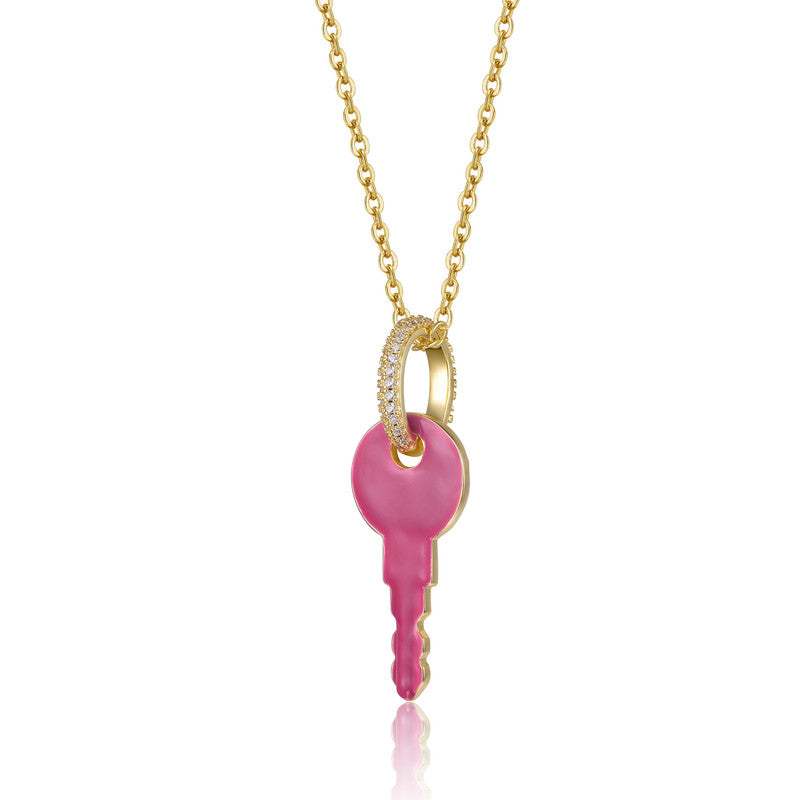 Unlock elegance with this 14K gold-plated key pendant necklace. Featuring vibrant pink enamel and sparkling clear cubic zirconia accents, it exudes charm and sophistication. The delicate design makes it a perfect accessory for any occasion, adding a touch of luxury to your outfit. A timeless piece that blends playful color with dazzling brilliance.