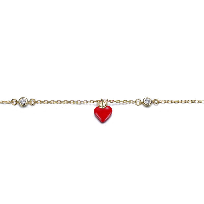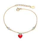 This exquisite 14K gold plating bracelet features a delicate chain adorned with a captivating red heart charm at its center, symbolizing love and passion. Two dazzling cubic zirconia stones elegantly frame the heart, adding brilliance to the design. The adjustable clasp ensures a perfect fit for any wrist, making it both stylish and comfortable to wear. A timeless accessory that effortlessly blends elegance and sentiment, perfect for gifting or elevating everyday looks.