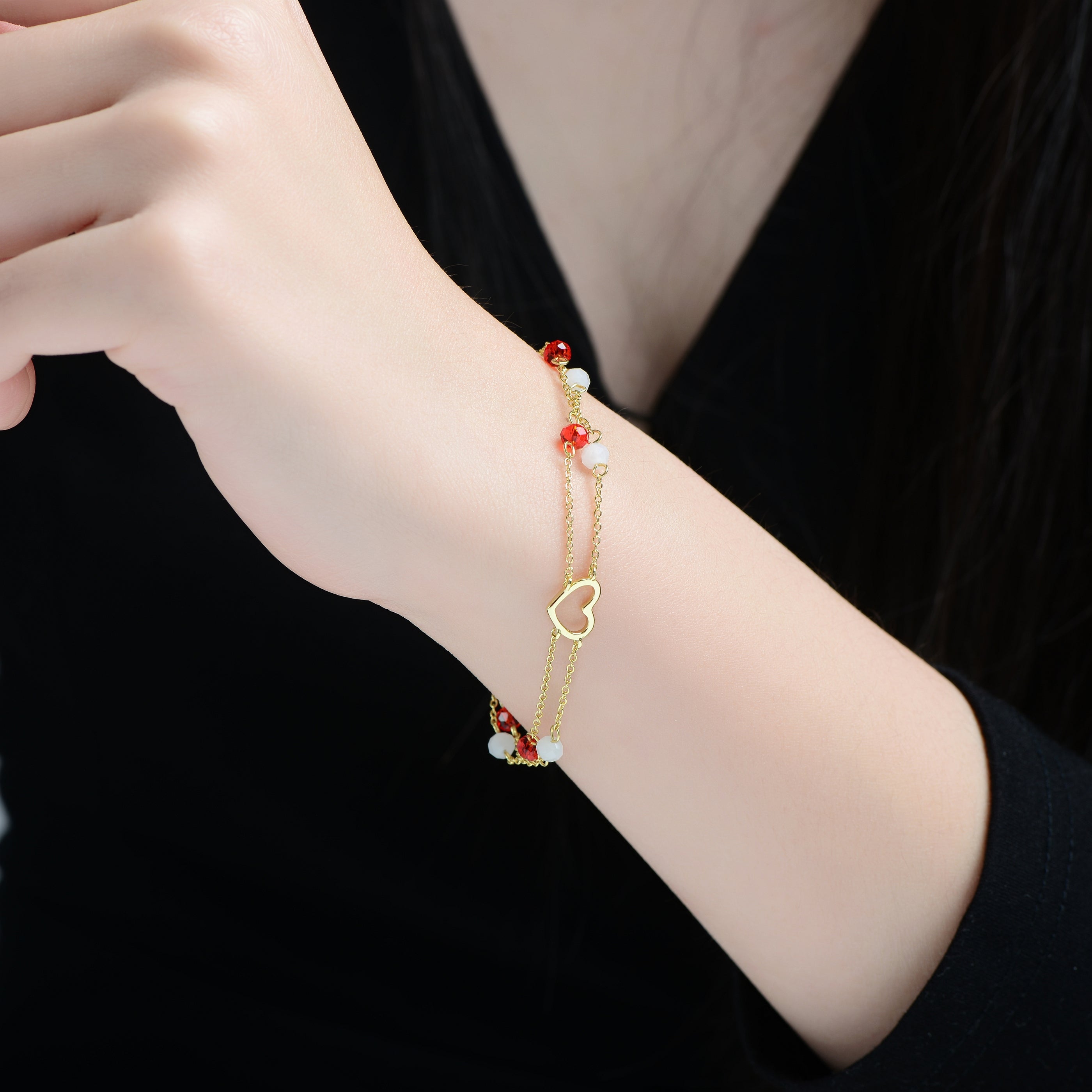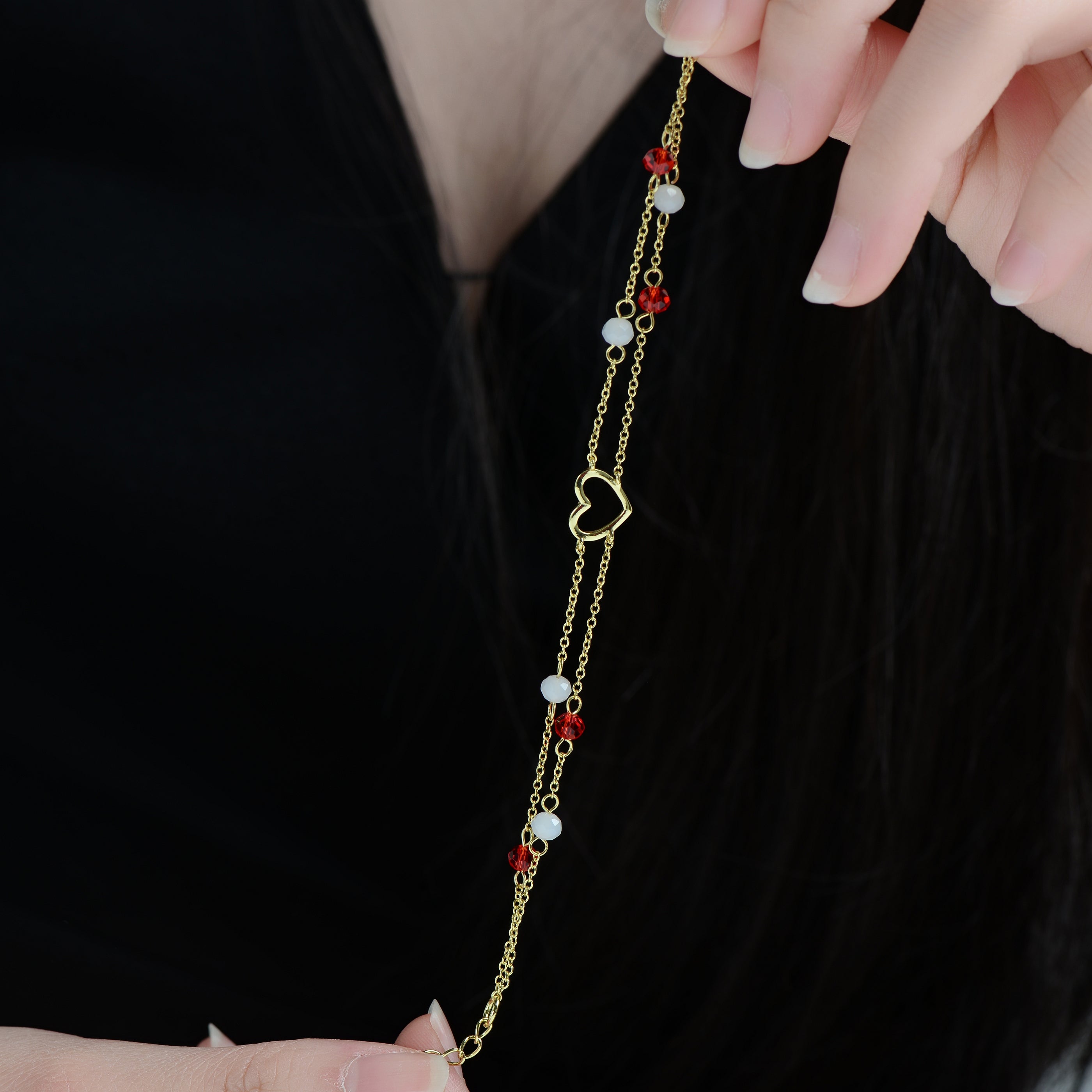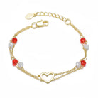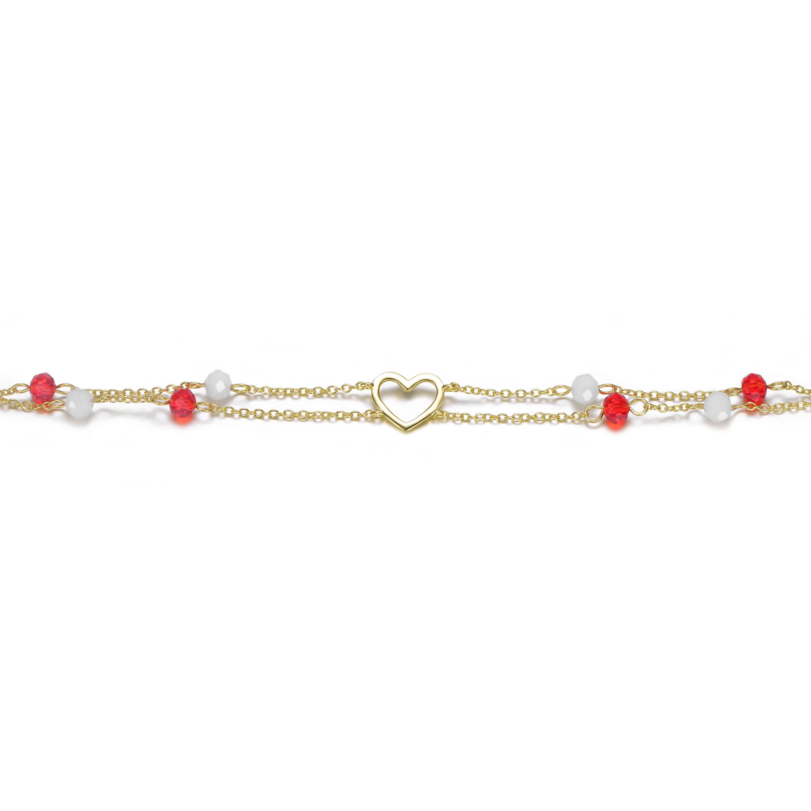 14K Gold-Plated with Red & White Beads Double Chain Open Heart Bracelet