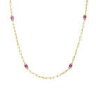 This exquisite necklace features 14K gold plating for a timeless and luxurious appeal. The delicate chain is adorned with striking ruby red square accents, spaced evenly along the links, creating a vibrant contrast against the warm gold tones. The elongated chain links enhance the necklace's elegance, while the ruby accents add a touch of sophistication and charm. Perfect for special occasions or as a statement piece, this necklace embodies a blend of classic style and modern flair, making it a versatile addition to your jewelry collection.
