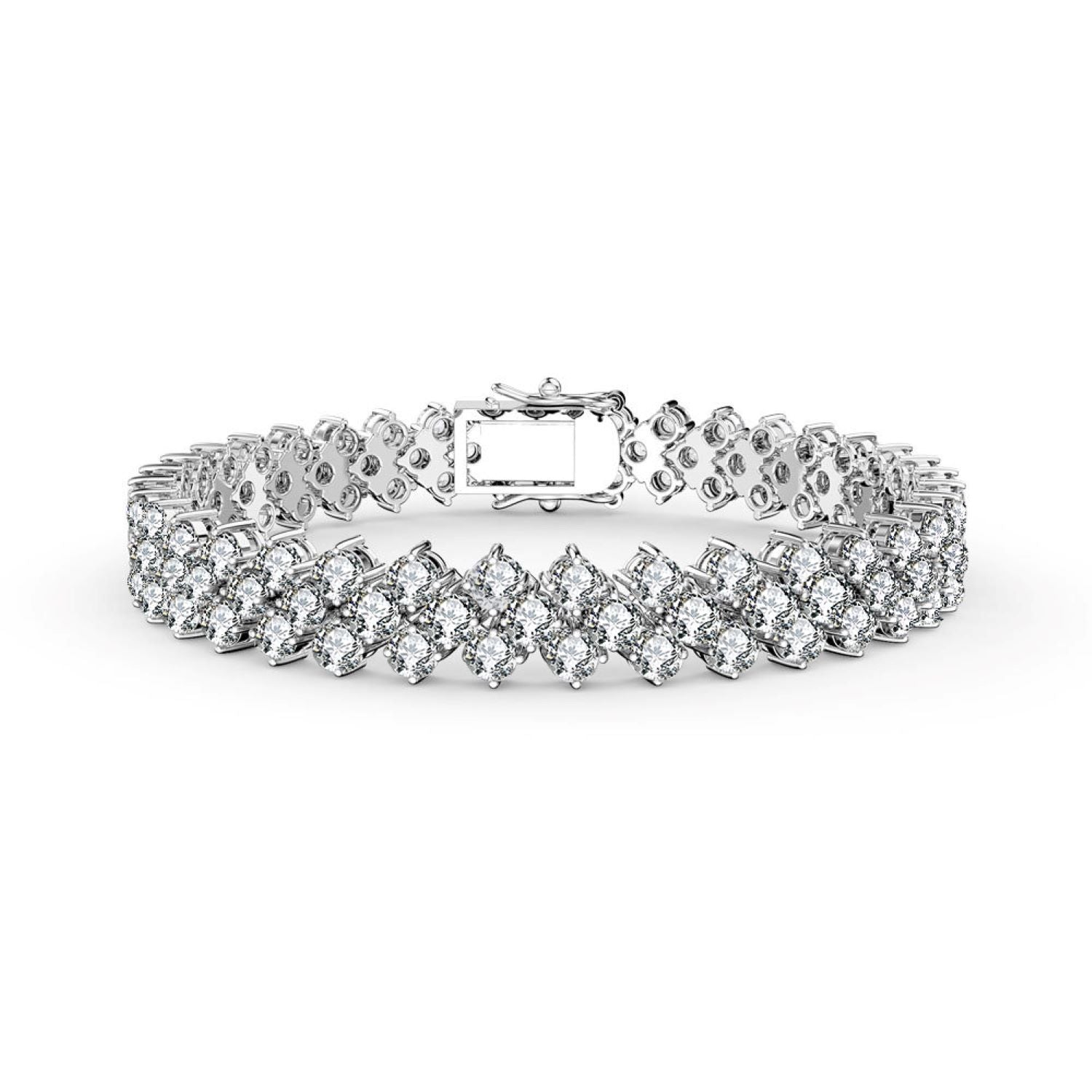 Very stylish rhodium plated three row bracelet. The three row bracelet features clear round brilliant simulated diamonds in four prong settings. Crafted of rhodium plated and it is secured with box clasp. Bracelet width: 7.5mm. Exquisite piece of jewelry.