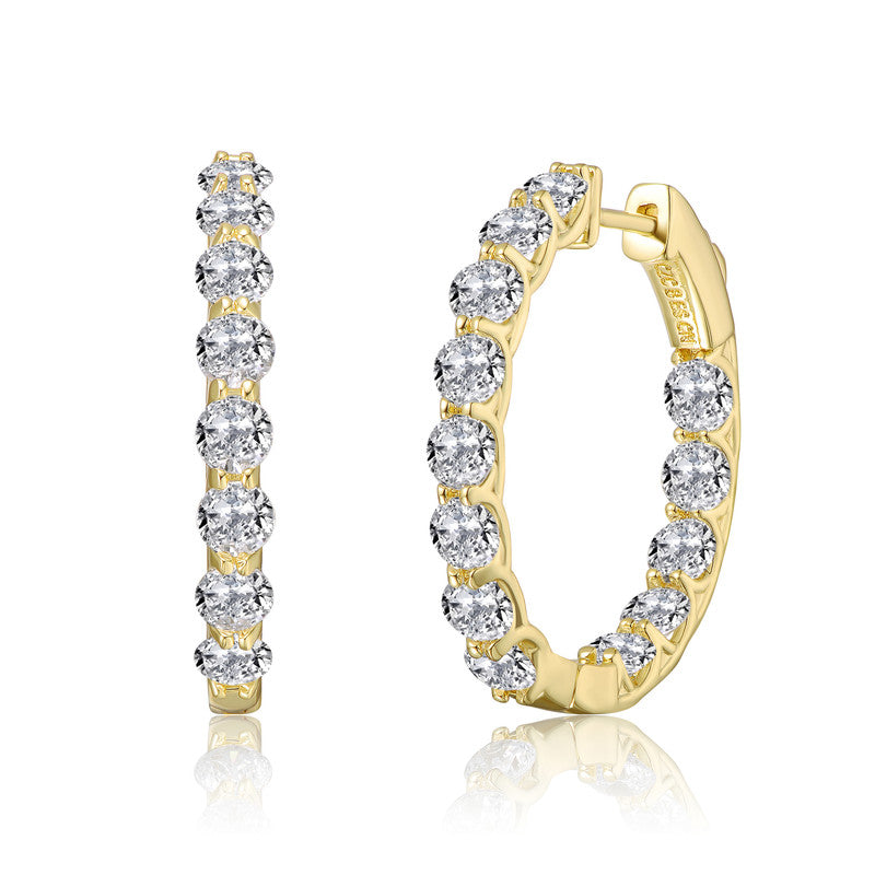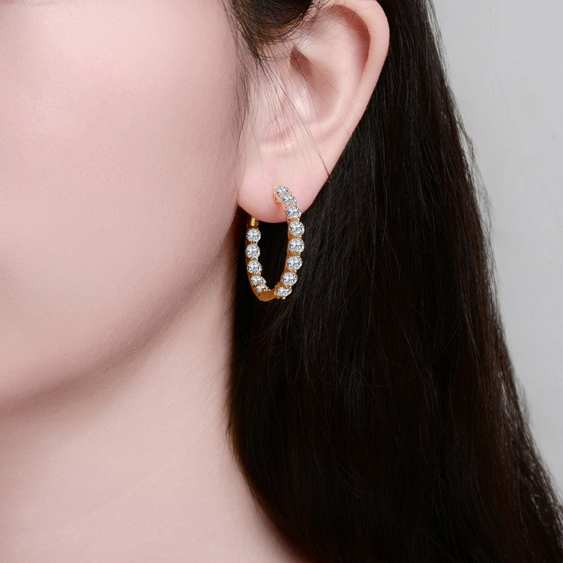 These elegant hoop earrings feature a sleek design, encrusted with sparkling clear cubic zirconia stones that catch the light beautifully. Available in both White Gold Plated and 14K Gold Plated finishes, they offer a versatile and luxurious look. The secure fit ensures comfort, making them perfect for both casual and formal occasions. Elevate your style with these dazzling earrings.