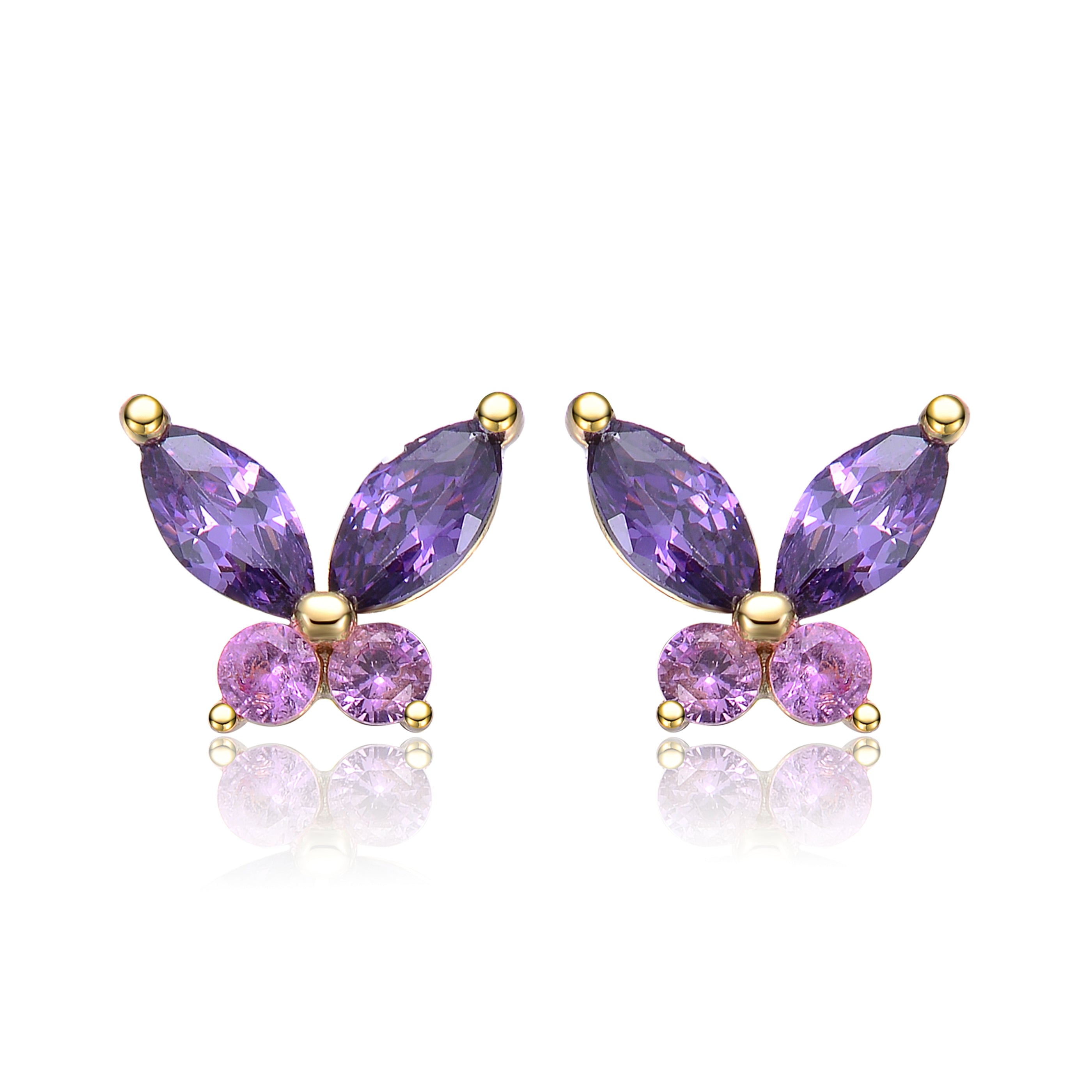 Delight your little one with these charming 6.7mm butterfly earrings, specially designed for toddlers and kids. Featuring a 14k gold plating, these earrings showcase a shimmering gold pearl at the center. The lower wings are adorned with light pink round cubic zirconia stones, while the top wings glitter with amethyst purple marquise-shaped cubic zirconia in a secure prong setting. Finished with a butterfly closure, these earrings ensure both style and comfort for your child's delicate ears.