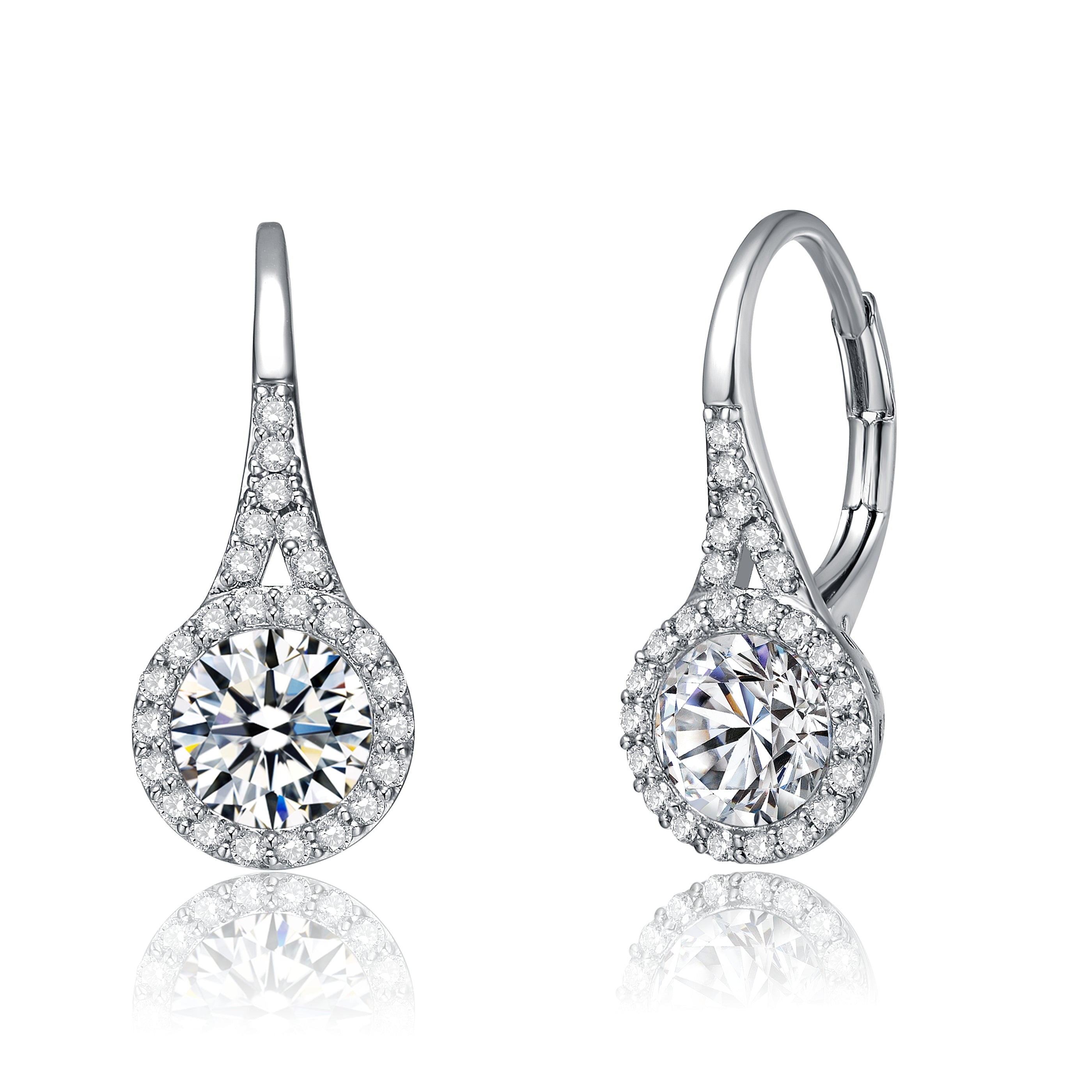 Elegant platinum plated halo round drop earrings. These sophisticated drop earrings feature the center of a large clear round Stones set in a four-prong setting. The center is surrounded by smaller clear round simulated Stones, paved on the round frame. These elegant drop earrings are comfortably secured with a leverback closure. Exquisite piece of jewelry for every occasion. Makes a great gift as well.