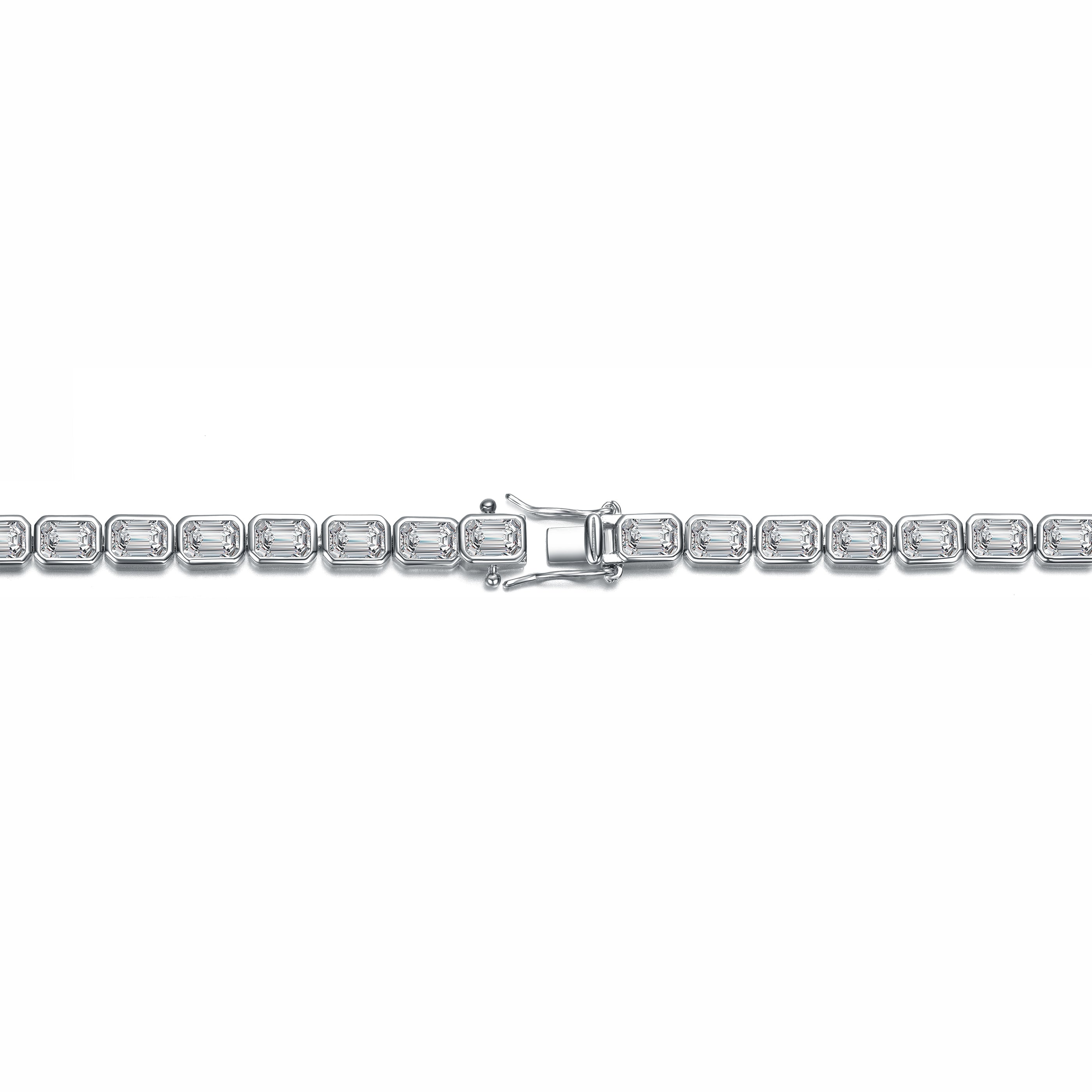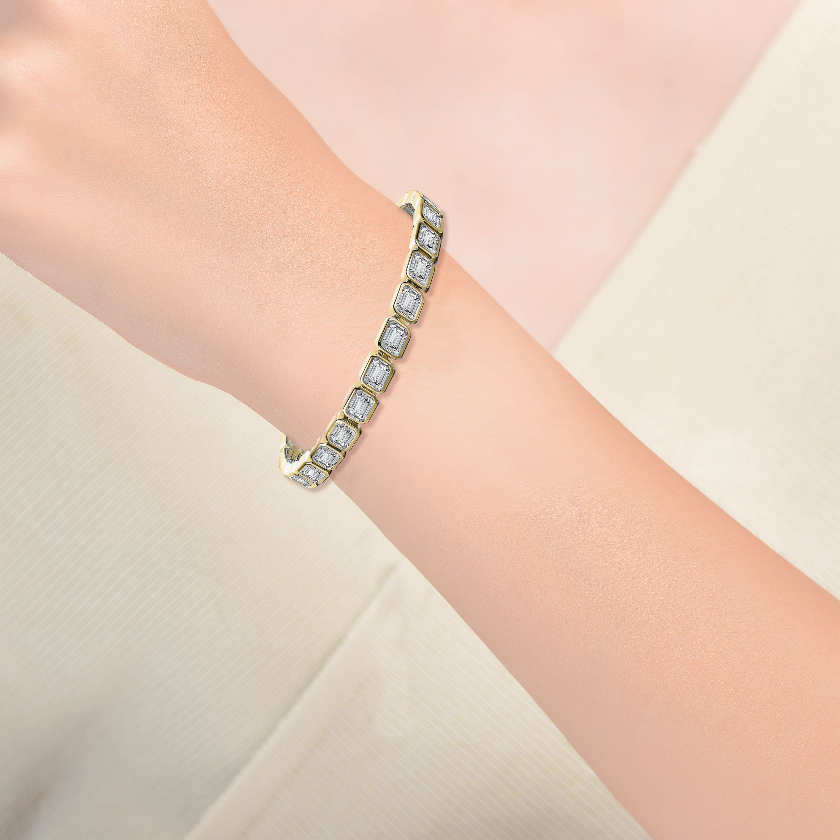 Elegance meets brilliance! Our Emerald-Cut Clear simulated diamond Tennis Bracelet is a dazzling masterpiece. Each simulated diamond is meticulously crafted in a bezel setting to radiate timeless allure. The box clasp ensures secure elegance. A sparkling statement for any occasion! This item is available in white gold or 14k yellow gold plated.
