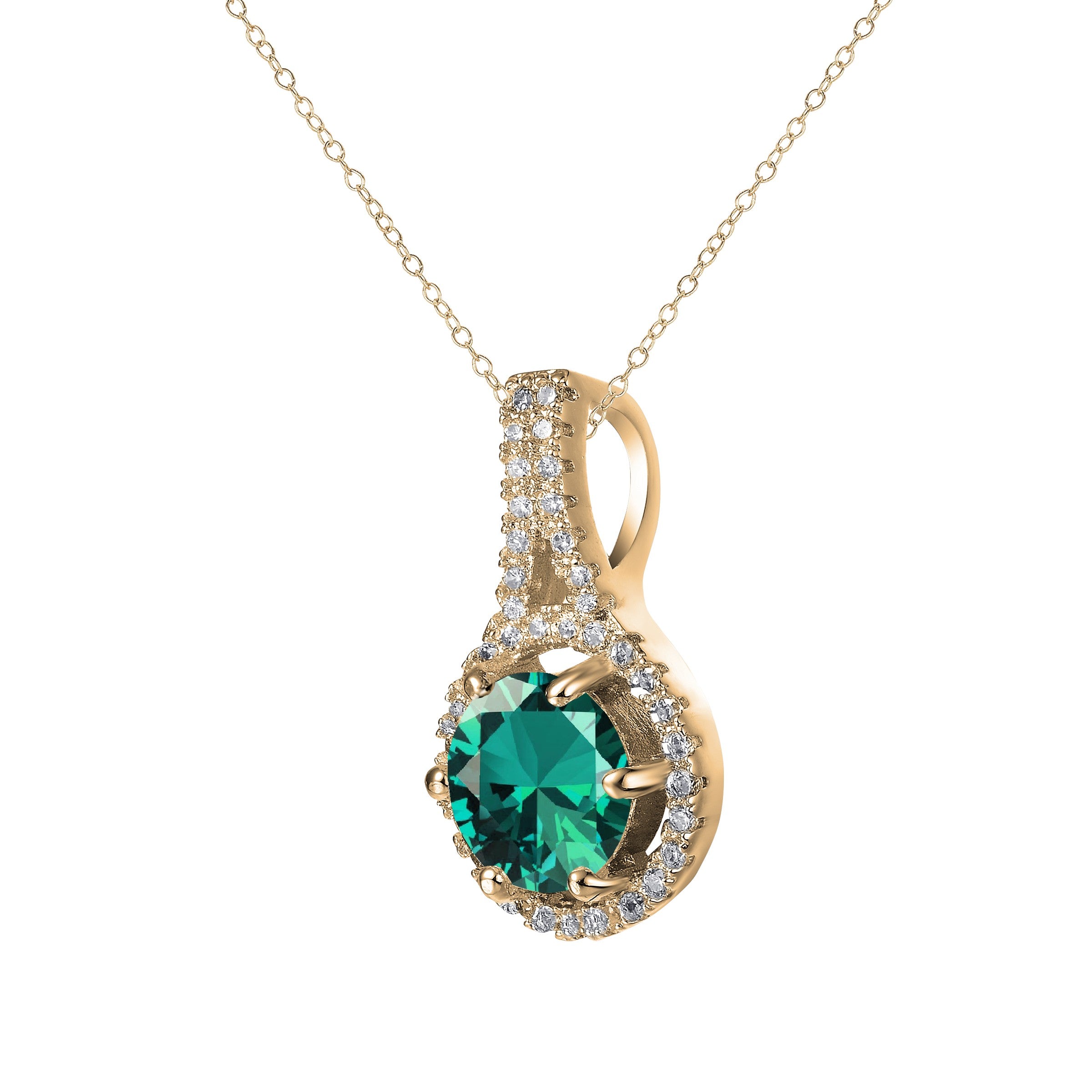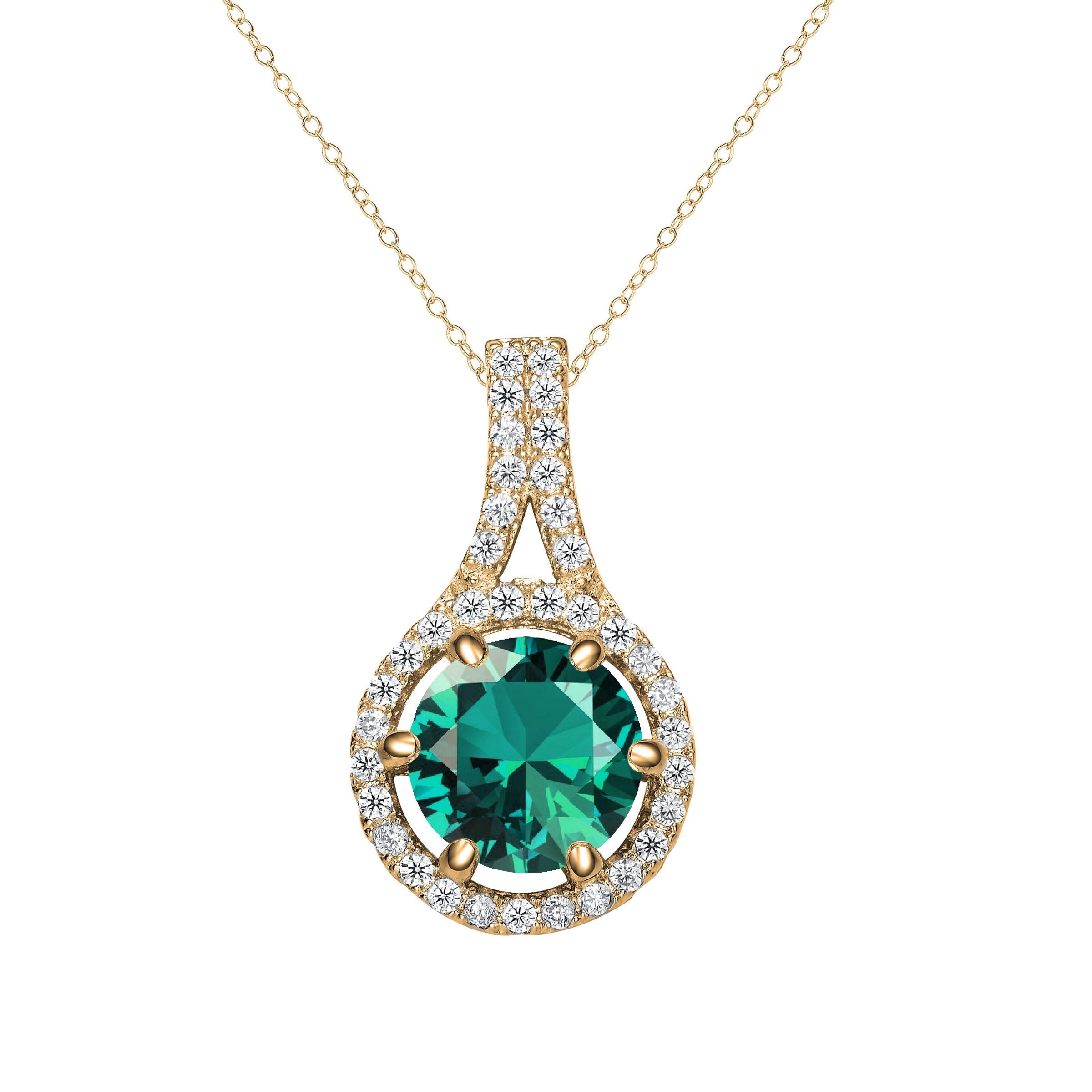 Level up your style with this 14k gold plated cubic zirconia drop pendant necklace. This necklace features fancy design, a halo studded with small round cubic zirconia and a big emerald green round cubic zirconia in the center of the frame. The upper part consists of two rounded cubic zirconia studded lines, connected at the top. Crafted in 14k gold plating and has a spring ring closure.
