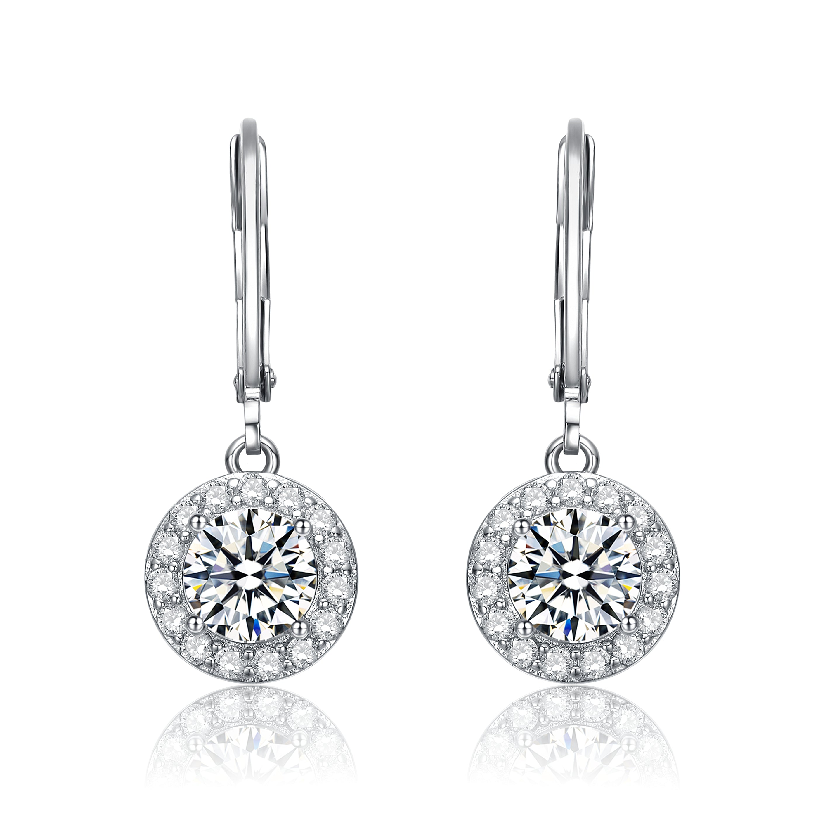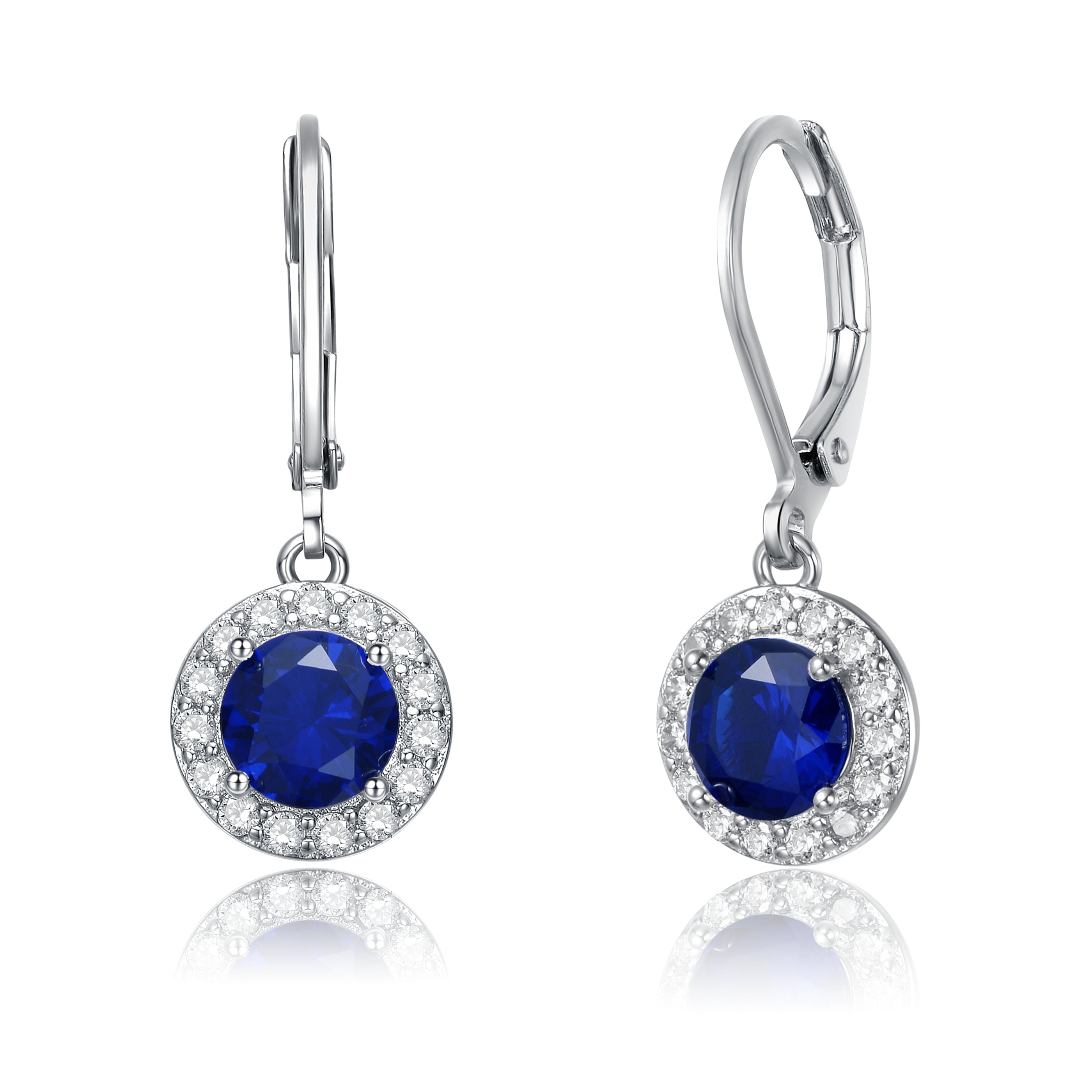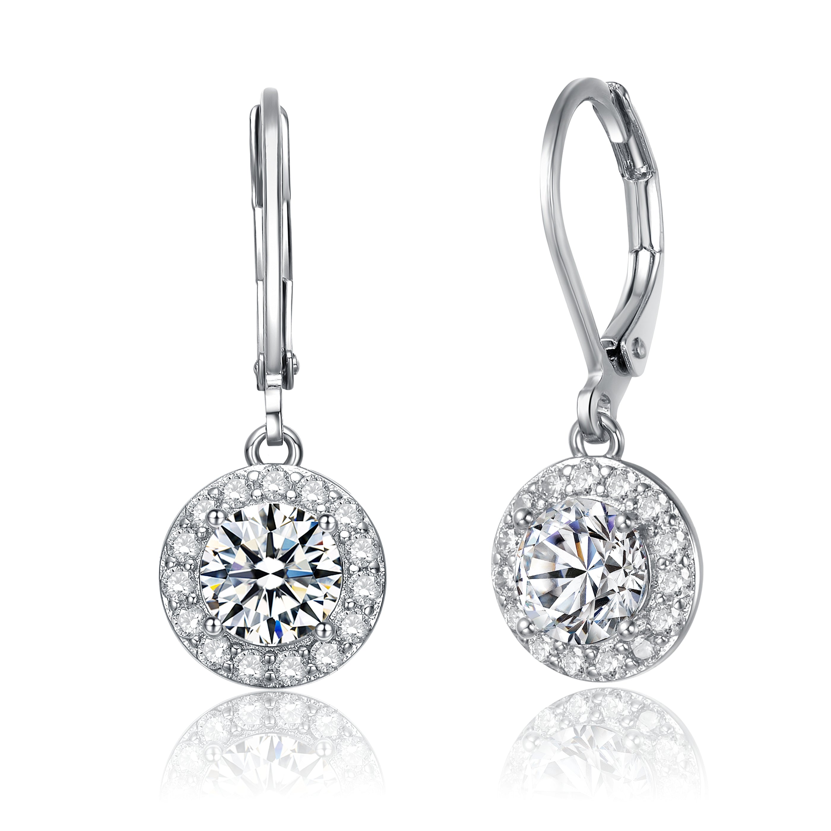 Sophisticated style is well within reach with these brightly polished dangle earrings, featuring round brilliant cut solitaire stones surrounded by smaller round brilliant cut stones in a dazzling halo cluster. Lever backs keep these elegant earrings in place, perfect for wearing to a special event, picture-perfect evening, and so much more with their timeless design. Exclusively available with platinum plated in white, emerald green or sapphire blue, and 14k gold plated. Exquisite piece of jewelry for every occasion. Makes a great gift as well.