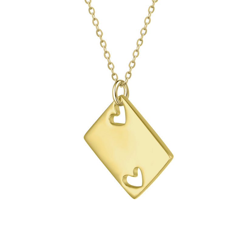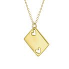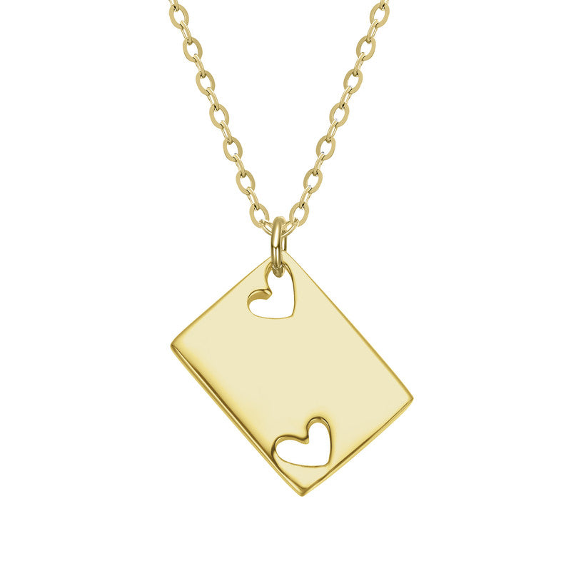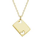 This elegant necklace features a rectangular pendant adorned with two delicate heart-shaped cutouts, one near the top right corner and the other near the bottom left corner. The 14K gold plated finish adds a touch of sophistication, making this piece a perfect symbol of love and elegance. A beautiful addition to any jewelry collection.