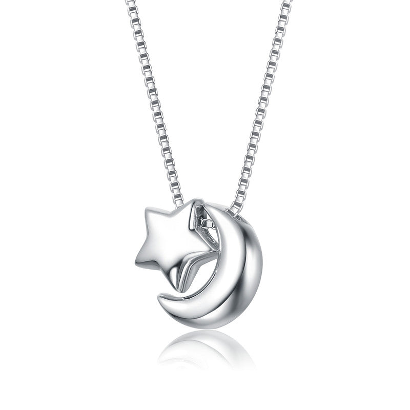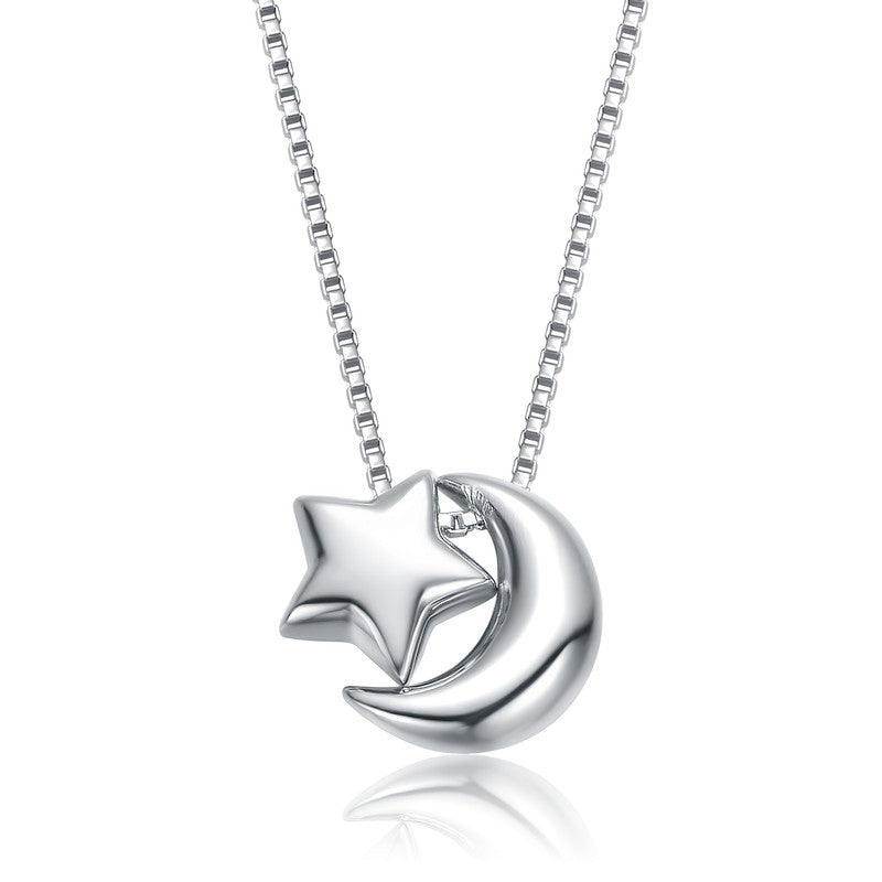 This elegant necklace features a polished white gold plated pendant with a star and crescent moon design. The delicate box-style chain enhances the celestial motif, making it a perfect accessory for those who adore timeless, celestial beauty. Its symbolic charm and refined finish make it an ideal gift or addition to your jewelry collection.