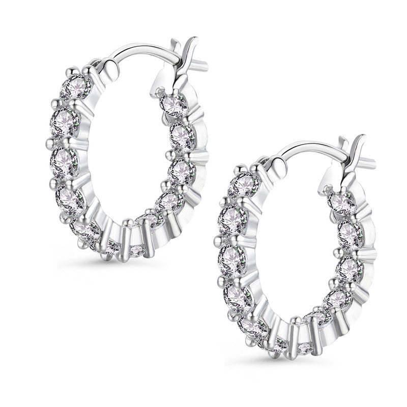 These sparkling hoop earrings feature round brilliant cut cubic zirconias prong set on the exterior and interior. Click-top posts keep these earrings secure, perfect for wearing day, night, to work, or on special occasions with their timeless elegance and understated glamor.