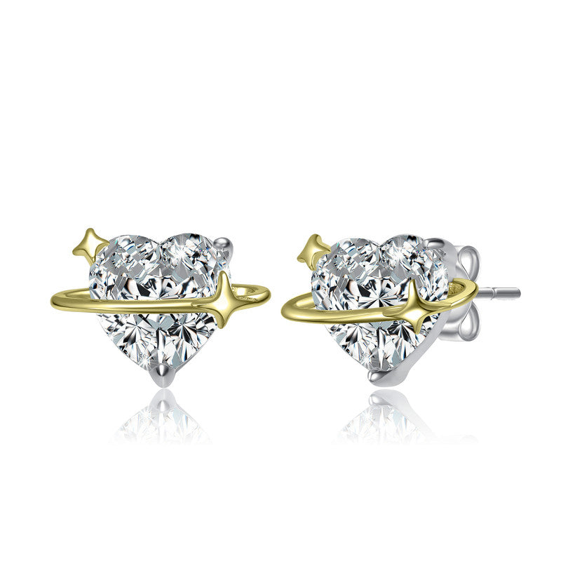 Two Tone with Clear Cubic Zirconia Heart & Star Design Stud Earrings. These beautiful earrings add a touch of romance with these white gold-plated & 14k gold-plated stud earrings, featuring dazzling heart-shaped clear cubic zirconia stones. A graceful yellow accent curves around each stone, enhancing its brilliance and adding a warm glow. The sleek design blends classic charm with modern elegance, perfect for everyday sparkle or special moments. Lightweight and radiant, these studs are a timeless expression of love and style.