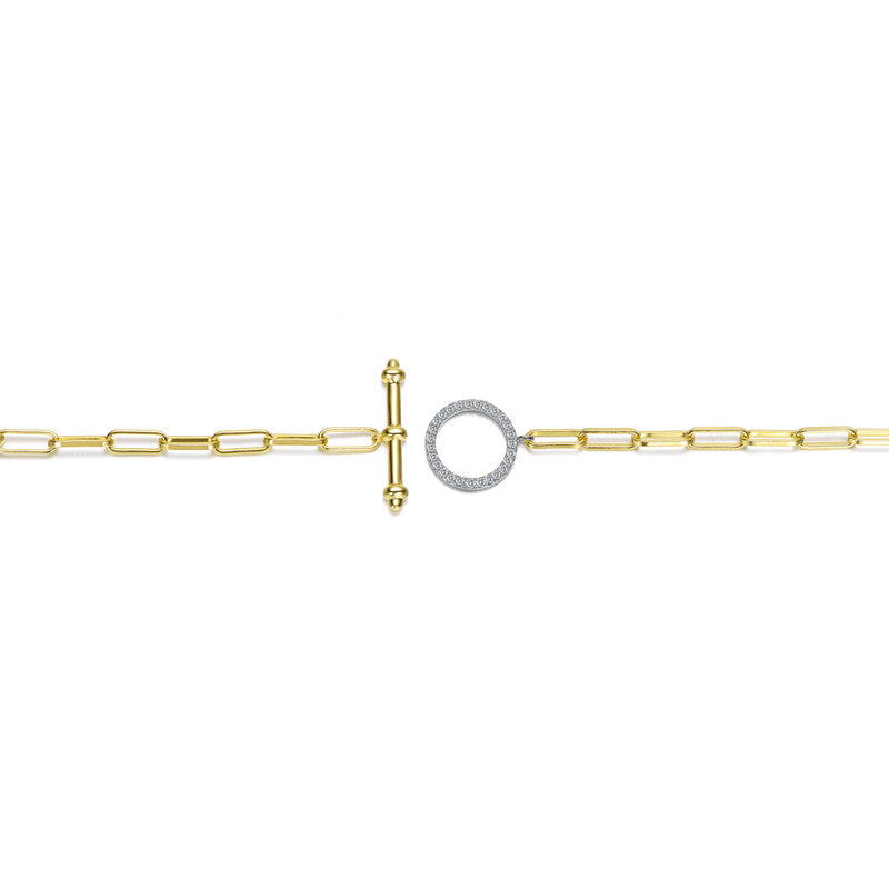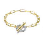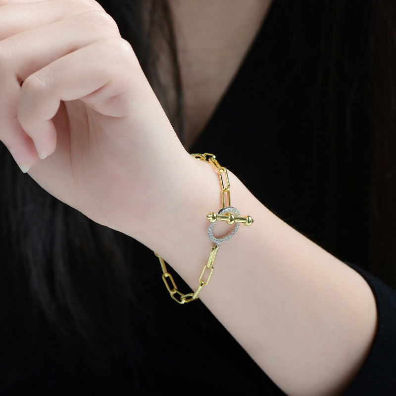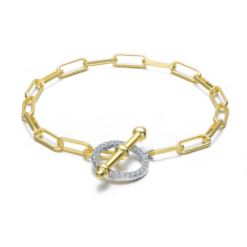 This elegant bracelet showcases a refined design with two-tone white gold plated & 14K gold-plated rectangular links, forming a sleek and modern chain. The standout feature is its toggle clasp, adorned with brilliant clear cubic zirconia stones, adding a touch of sparkle and sophistication. Perfect for both casual and formal occasions, this accessory effortlessly combines timeless luxury with contemporary charm.