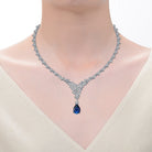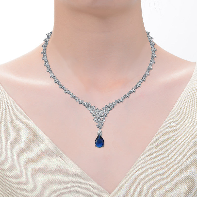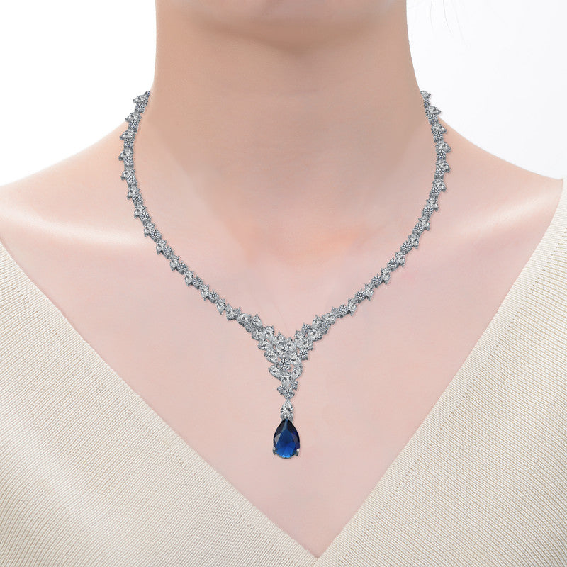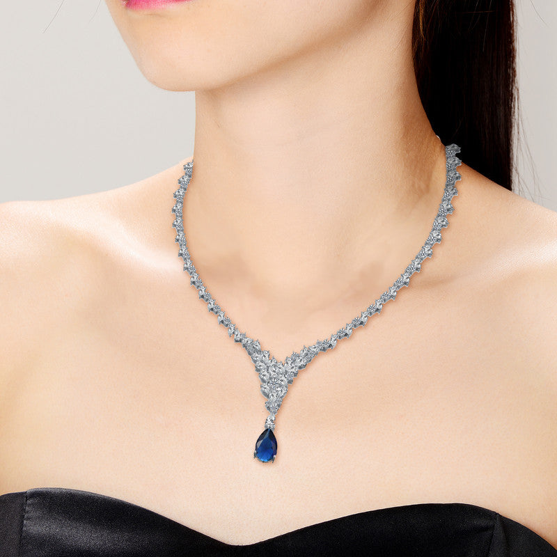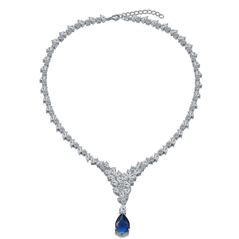 White Gold Plated Cubic ZIrconia Cluster Bridal Y-Necklace. This brightly polished white gold plated bridal necklace features sparkling mixed-cut cubic zirconia prong set in a stunning Y-shaped cluster with a raindrop pear-shaped blue cubic zirconia in the front. This pretty necklace tapers into a smaller width on the back, allowing this beautiful formal, semi-formal, or special attire necklace to sit comfortably on the collarbone. Celebrate your next special moment with something picture-worthy. Necklace measures: 16"