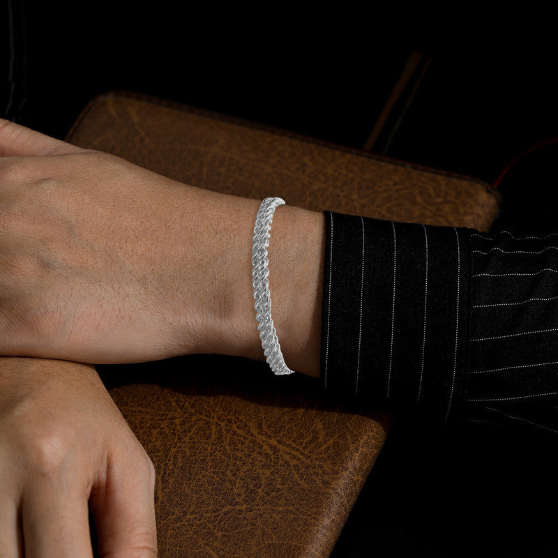 White Gold Plated Mesh Link Bracelet. Upgrade any outfit with a glamorous detail with this brightly polished white gold plated bracelet. The luxurious, chunky link chain of this bracelet highlights its pretty shine, bringing out the details and texture. A lobster clasp keeps this statement bracelet secure, making it the perfect choice for wearing solo, or next to other bracelets for an accessorized, stacked style.