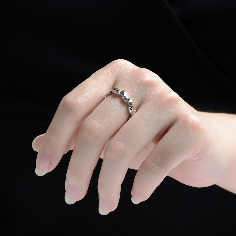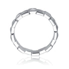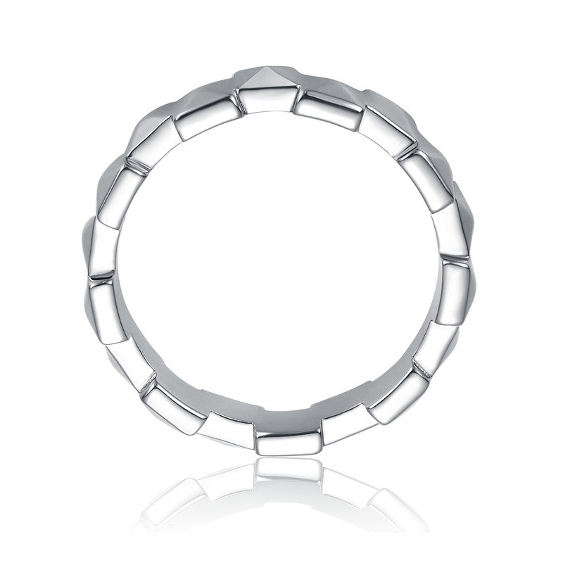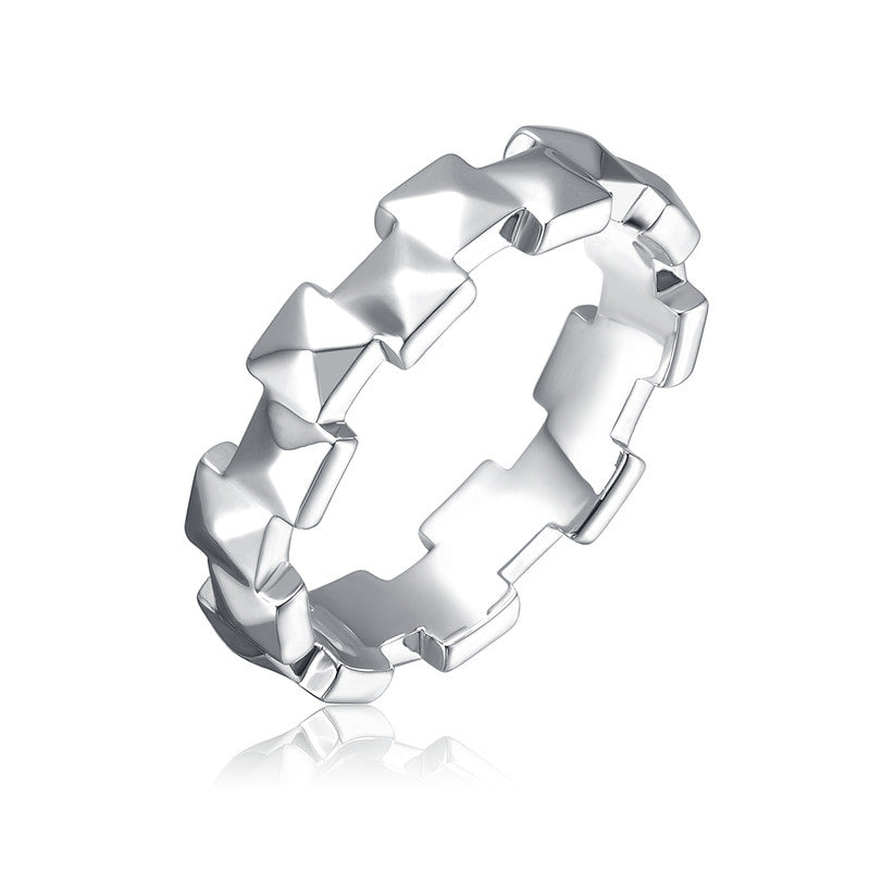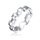 White Gold Plated Statement Ring. This beautiful White Gold Plated Statement Ring is bold and modern, featuring a striking pyramid-patterned band that catches light from every angle. Crafted with precision, its geometric design adds edge and elegance to any look. It offers a substantial feel without compromising comfort. Ideal for those who love architectural flair and standout accessories, this ring makes a powerful impression-whether worn solo or stacked for extra drama. Available in sizes 6, 7 & 8.