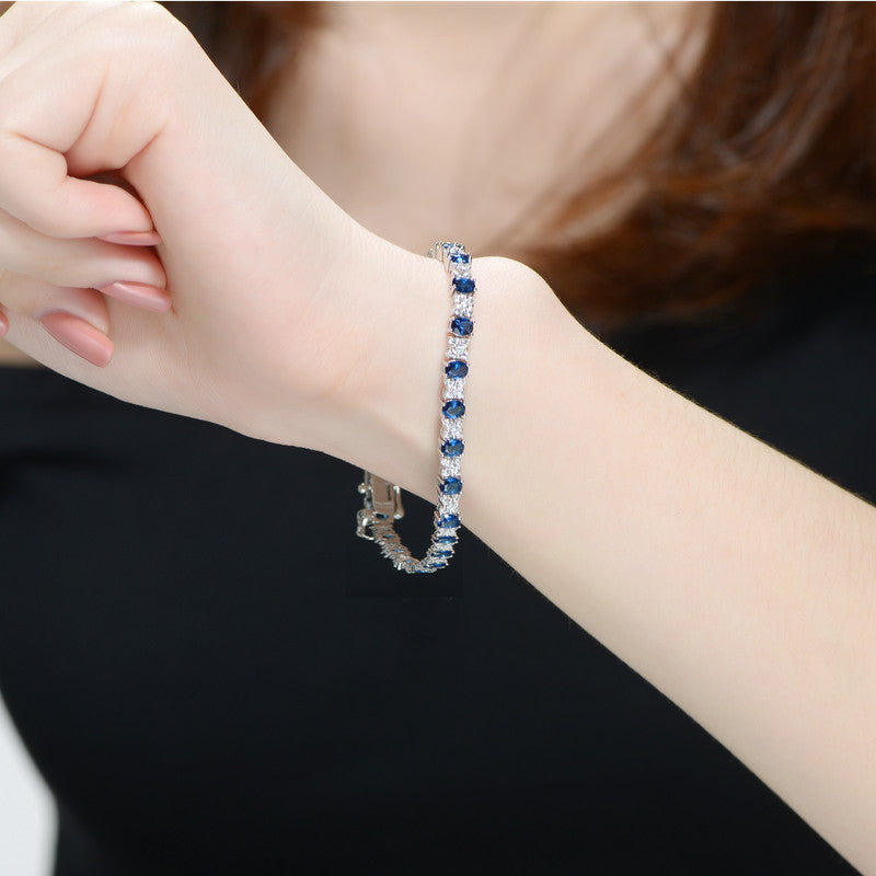 Add a splash of color to your wrist with this stunning white gold-plated tennis bracelet. Featuring a series of dazzling colored and clear alternating cubic zirconia stones in a timeless design, it exudes elegance and charm. Perfect for special occasions or daily wear, its secure clasp ensures comfort and style. A versatile and radiant accessory to enhance any outfit. This bracelet is available with sapphire blue and clear or emerald green and clear cubic zirconia.