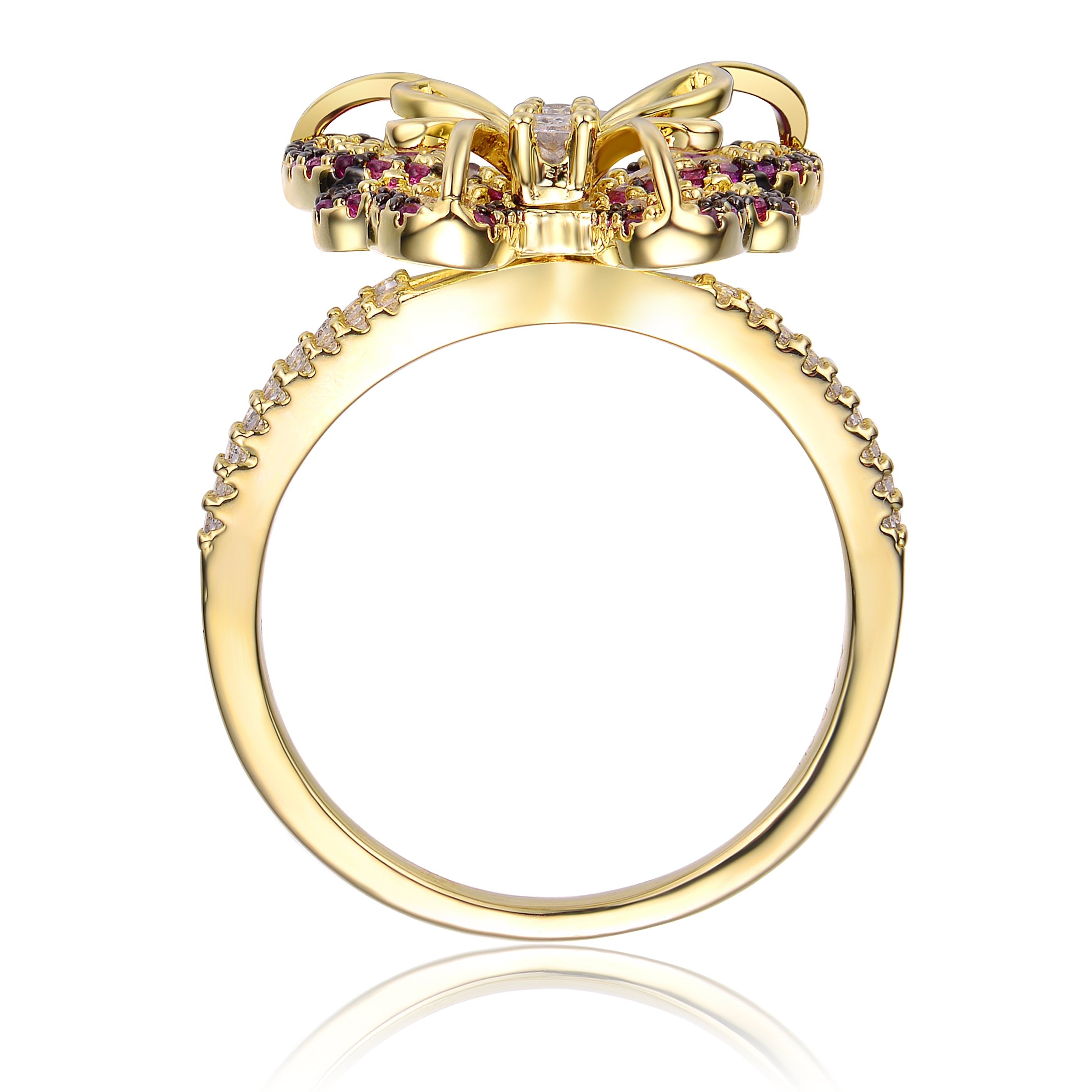 Cubic Zirconia Butterfly Split Top Ring. Butterflies symbolize growth, happiness, and change, making this brightly polished 14k yellow gold plated ring perfect for wearing any time you need a boost of positive energy. Vibrant purple amethystcubic zirconia (February Birthstone) complements sparkling round brilliant cut cubic zirconias prong set in fanciful clusters, dusting the top of this enchanting butterfly and its wings. Additional stones set on the split shoulder shank finish the look. Available in ring sizes: 6-8