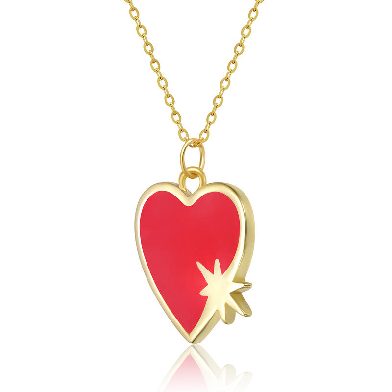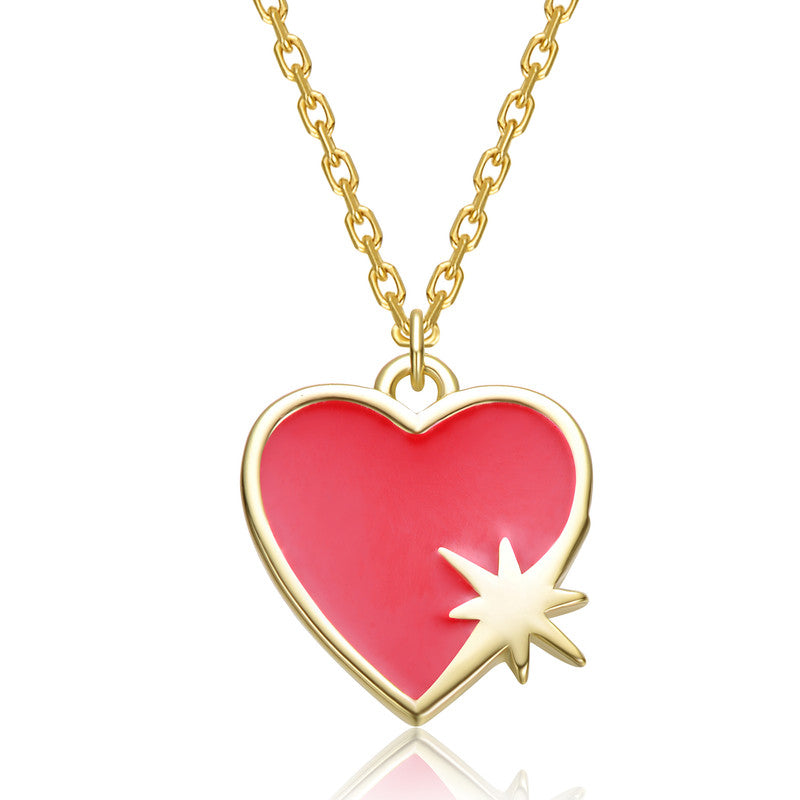 14K Gold Plated with Red Enamel Heart & Starburst Design Pendant Necklace For Kids
