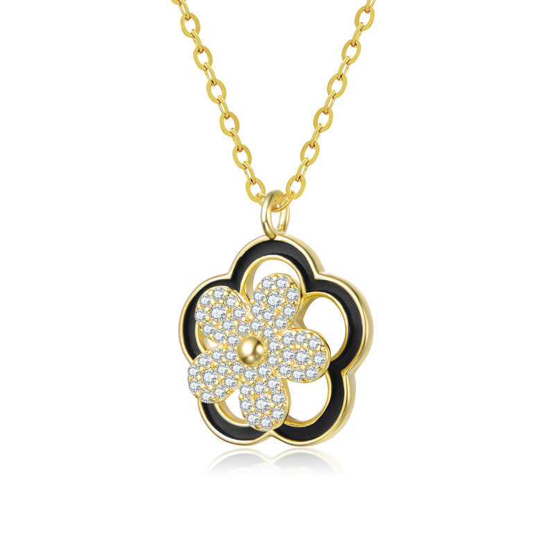 14K Gold Plated with Clear Cubic Zirconia & Black Enamel Flower Design Drop Pendant Necklace