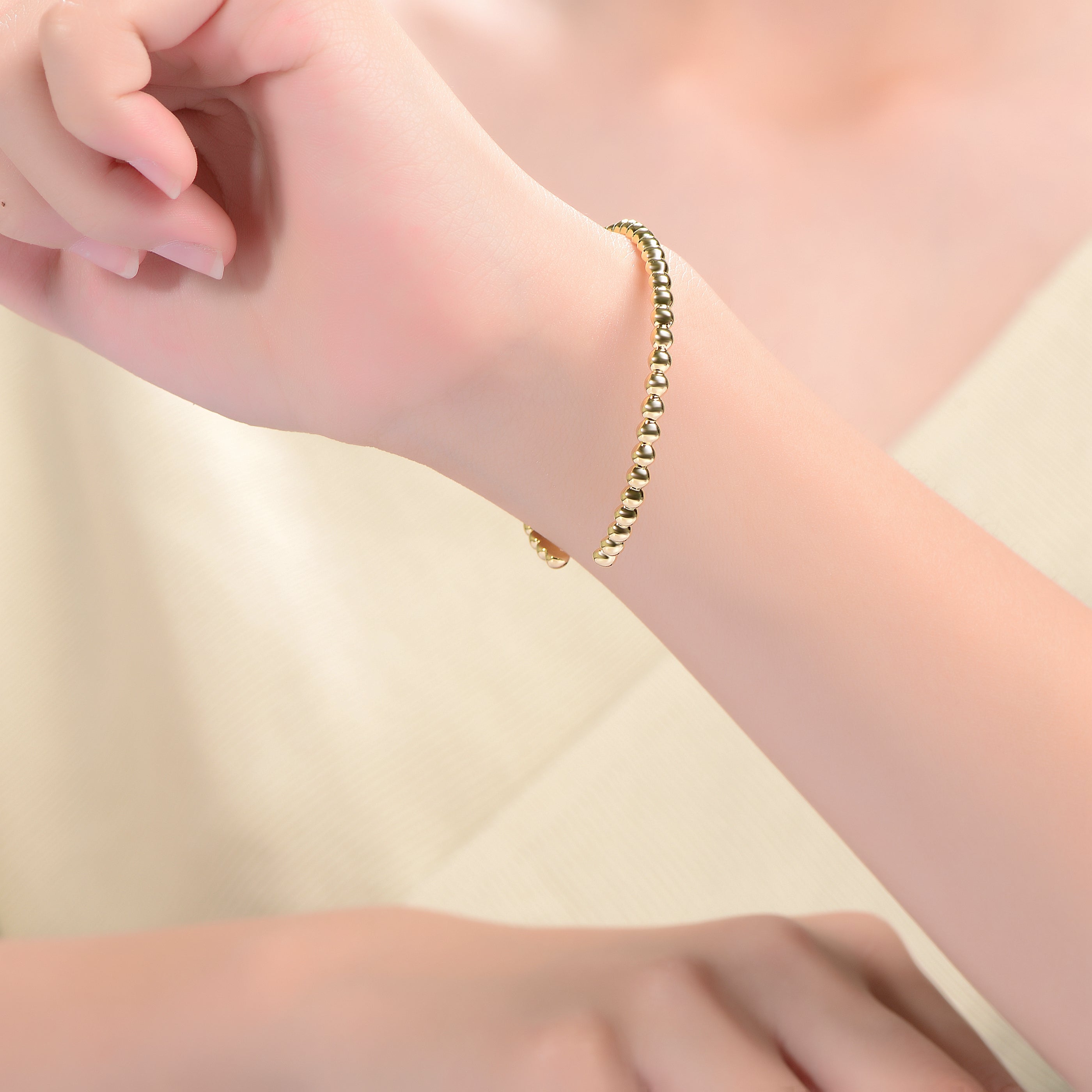 Stylish 14K Gold Plated Cuff Bracelet. This cuff bracelet features a design made out of small round elements, curved to perfection, placed one next to the other, forming that beaded look. Crafted with 14K Gold Plating and it is secured by pushing the cuff down slightly until it feels snug on your arm. Perfect piece of jewelry for stylish combinations. This item also makes a sensational gift.