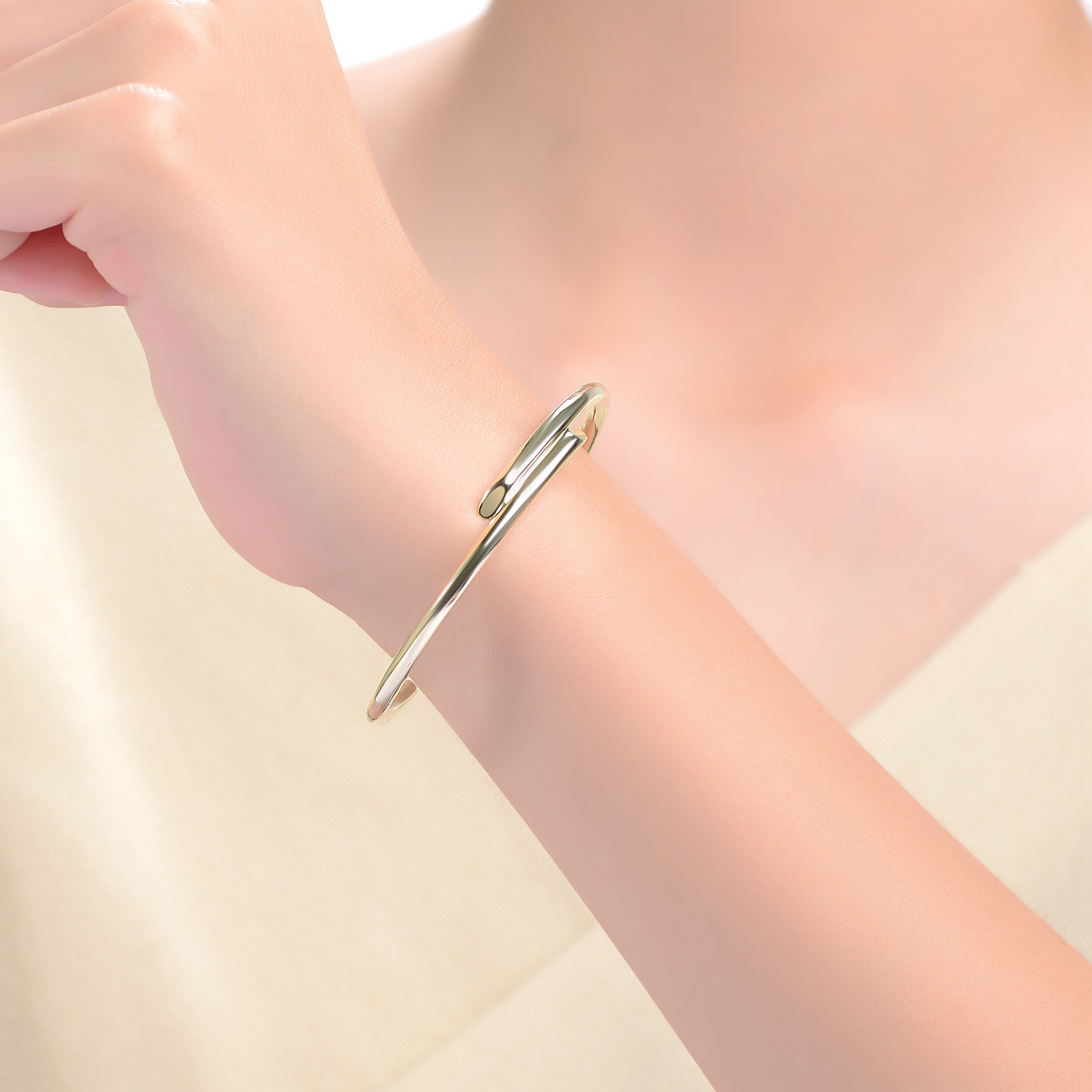 Stylish 14K Gold Plated Bypass Cuff Bracelet. This cuff bracelet features a simple design made out of two curved pieces that are placed one next to the other in the center. Crafted with 14K Gold Plating and it is secured by pushing the cuff down slightly until it feels snug on your arm. Perfect piece of jewelry for stylish combinations.