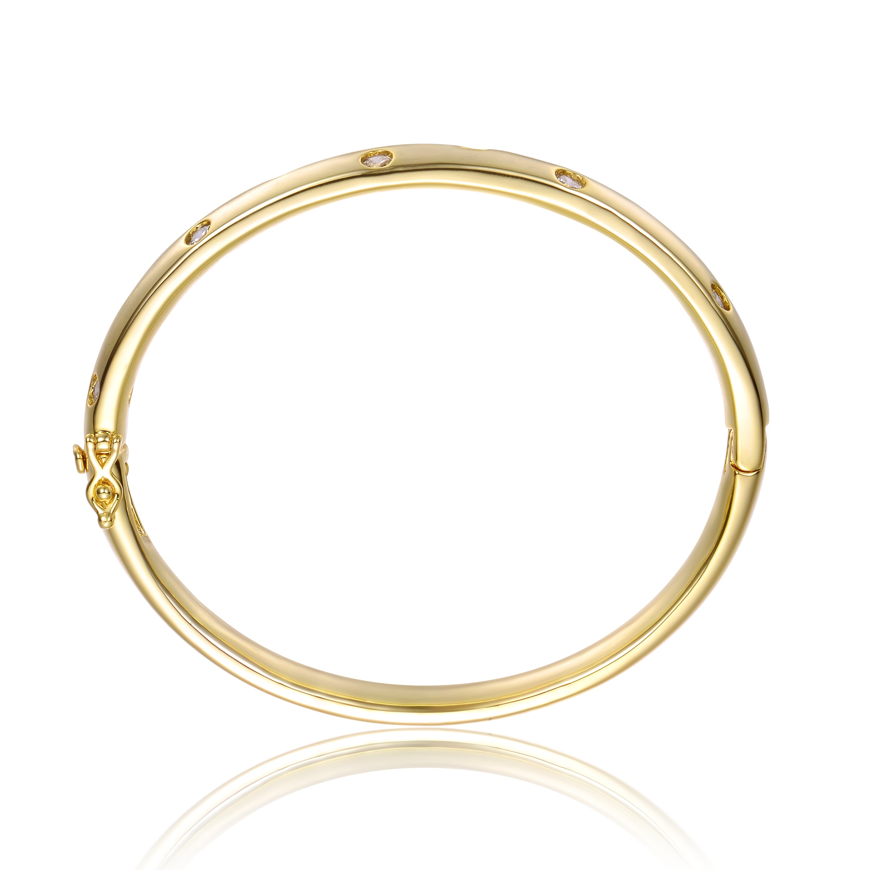 14k Gold Plated Starry Cubic Zirconia Bangle Bracelet. Sparkling round brilliant cut cubic zirconia are reminiscent of shimmering stars in the galaxy! This brightly polished 14k gold plated round bangle bracelet features sparkling round brilliant cut cubic zirconias bezel set in a star-inspired galaxy motif. A hidden box clasp keeps this shiny bangle bracelet in place, allowing it to lock in place. Mix and match this bangle with other bangles for a stacked look.