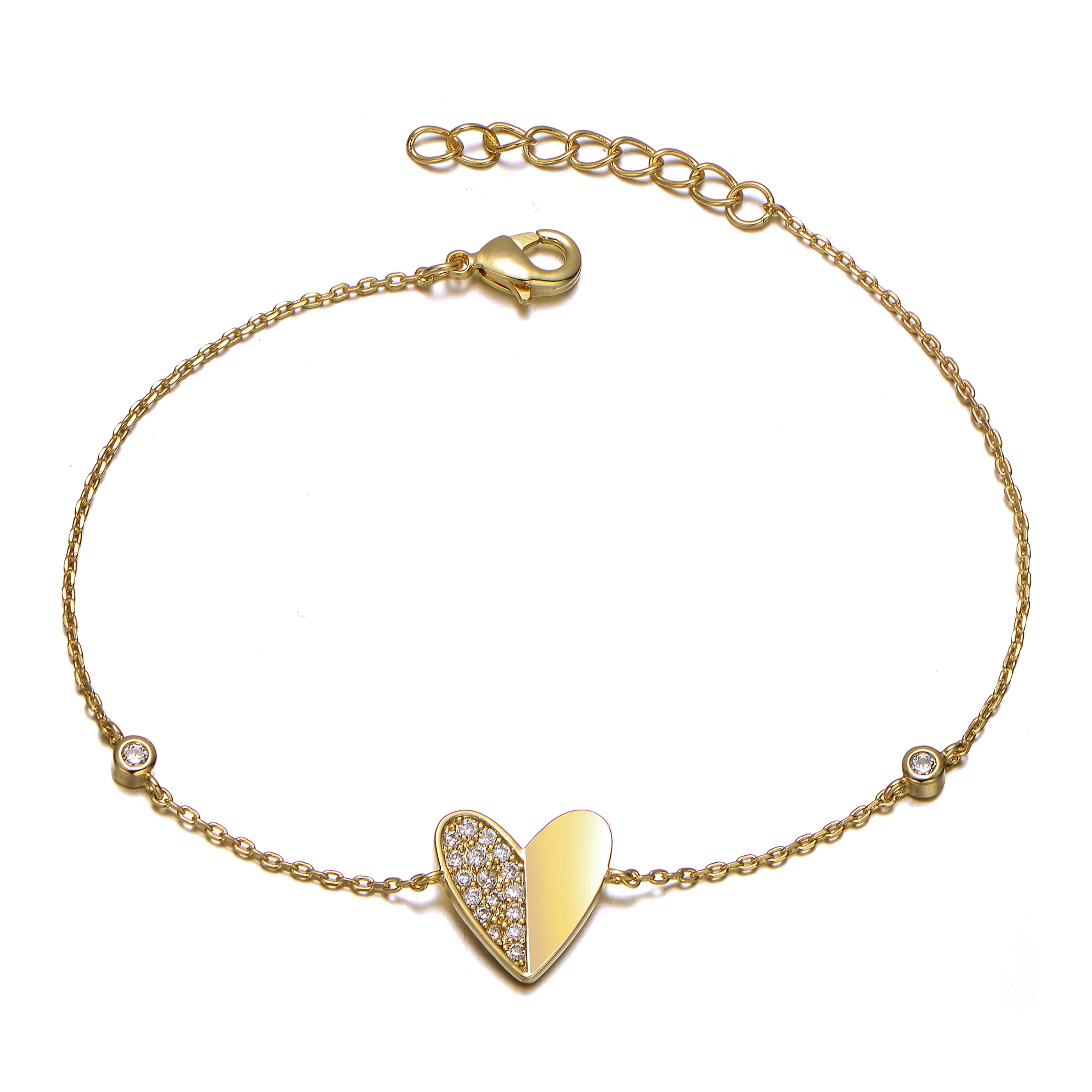 14k Gold Plated with Clear Cubic Zirconia Heart Station Charm Bracelet. Hearts symbolize everlasting love, affection, and commitment, making this enchanting 14k gold plated bracelet the ultimate choice for an anniversary, birthday, or holiday gift. A heart-shaped charm pendant sparkling with round brilliant cut cubic zirconia pave set on one side of the heart gives it a luxe detail. Small cubic zirconia accents set on the delicate cable chain give it a contemporary station style.