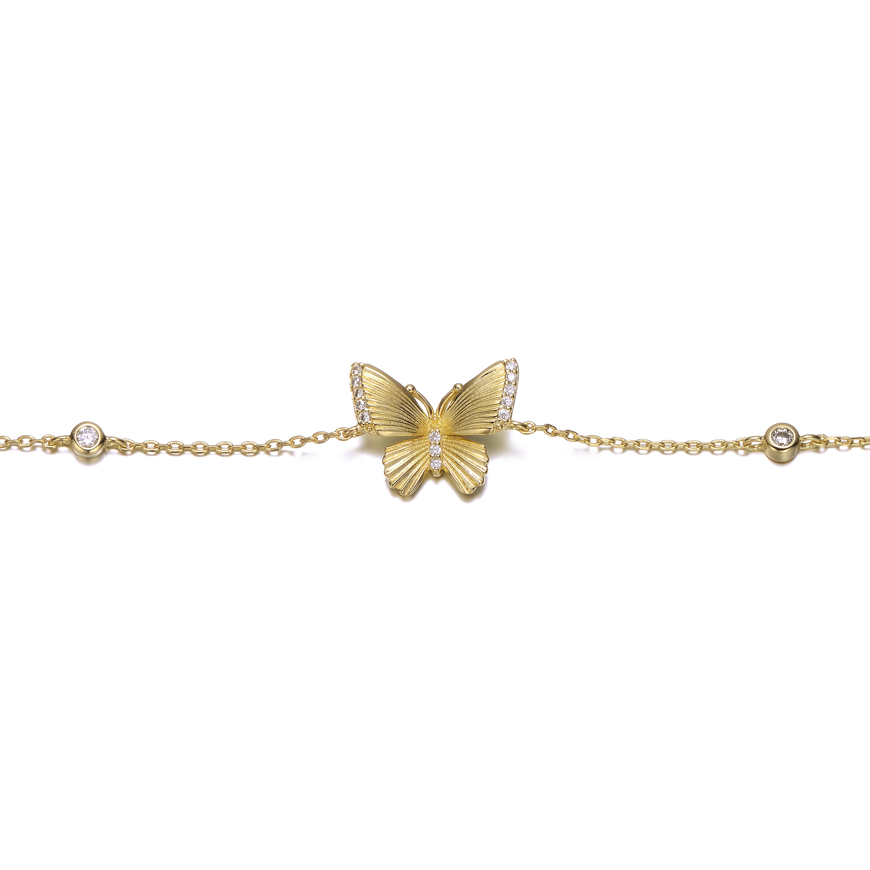 Embrace elegance and charm with this exquisite 14k gold plated butterfly bracelet, perfect for both teens and women. The center of this bracelet showcases a beautifully crafted gold butterfly, flanked by two sparkling cubic zirconia stones, each placed approximately 1 inch apart. This delicate design is completed with a secure lobster clasp, offering adjustable and comfortable wear. Ideal for adding a touch of sophistication to any outfit, this bracelet makes a wonderful gift for any occasion.