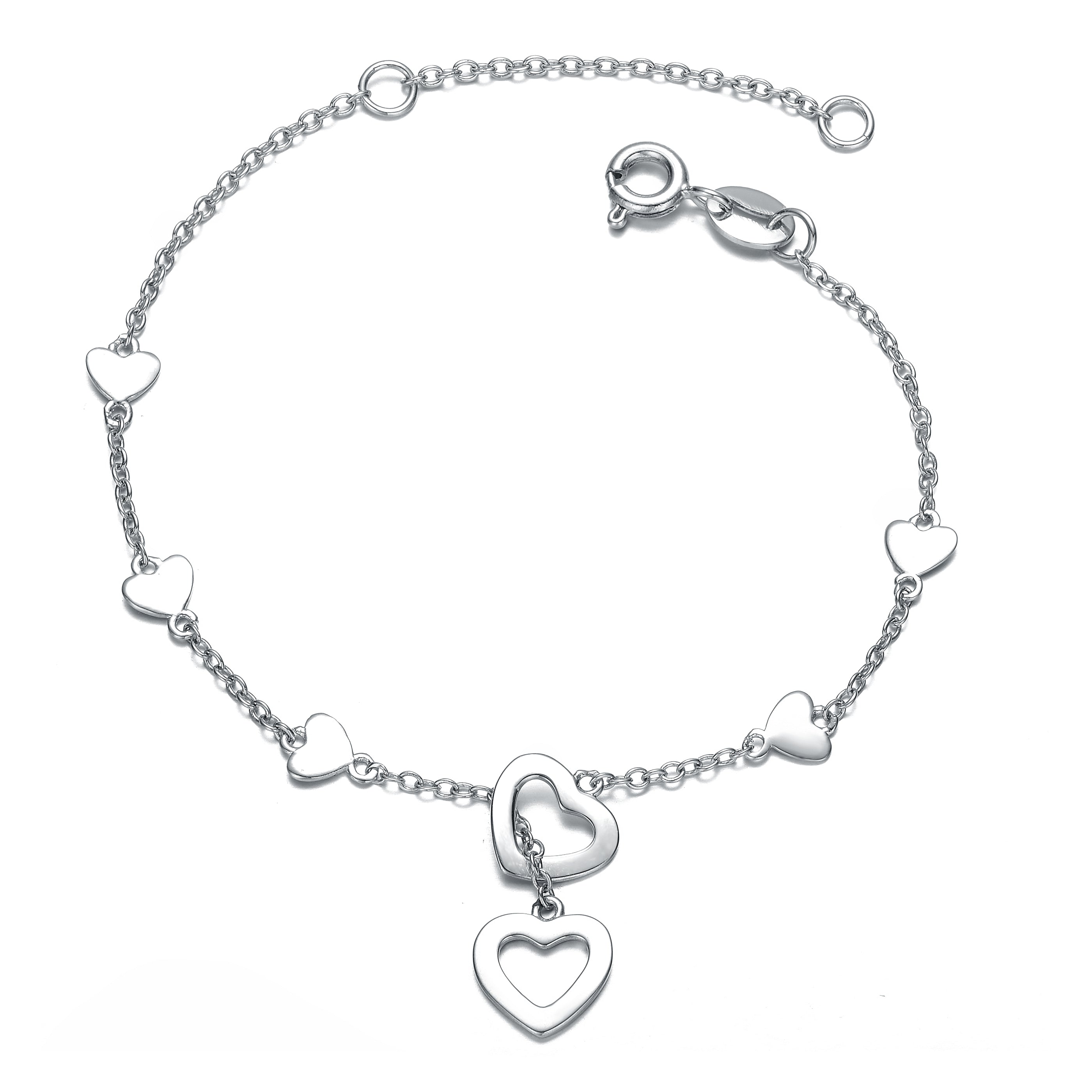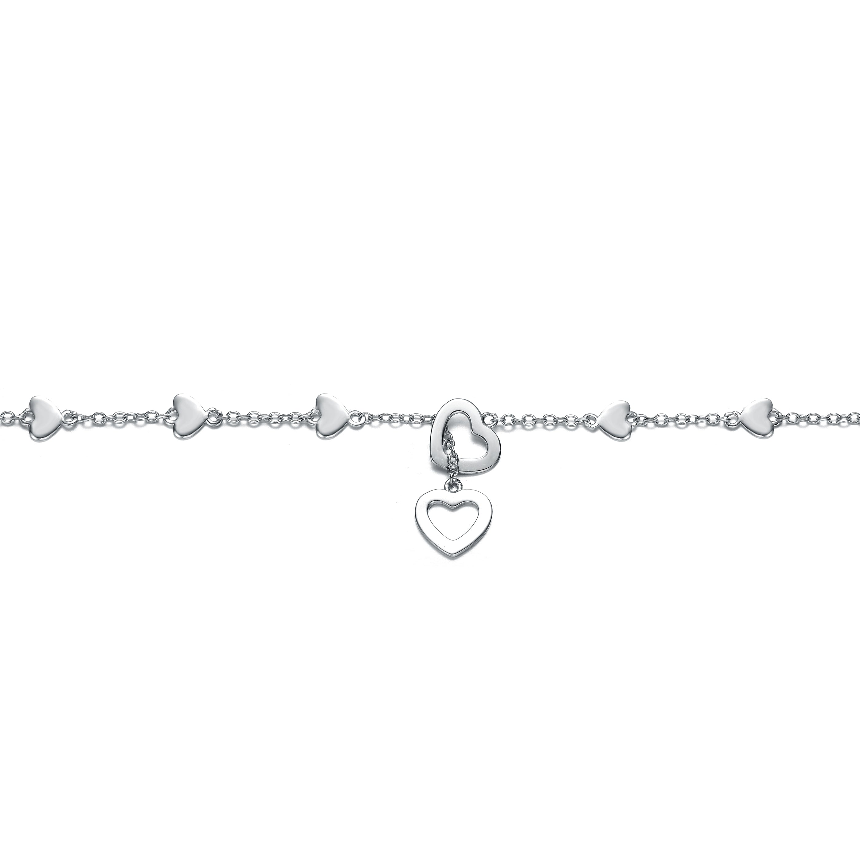 Children's/Teen's White Gold Plated Double Halo Heart Dangle Charm Station Bracelet, Adjustable in Length. Hearts symbolize love, hope, happiness, and joy, making this white gold plated bracelet a very special gift. Two ultra-shiny heart halo charms entwined give this bracelet a glamorous appeal, perfect for wearing with other bracelets for a layered look or solo. Small heart charms set in even intervals provide a fashionable, of-the-moment station style. A spring ring clasp with an extension chain accommodates wrist sizes up to 5+1" with adjustability. Recommended for childen, teens, and young adults.