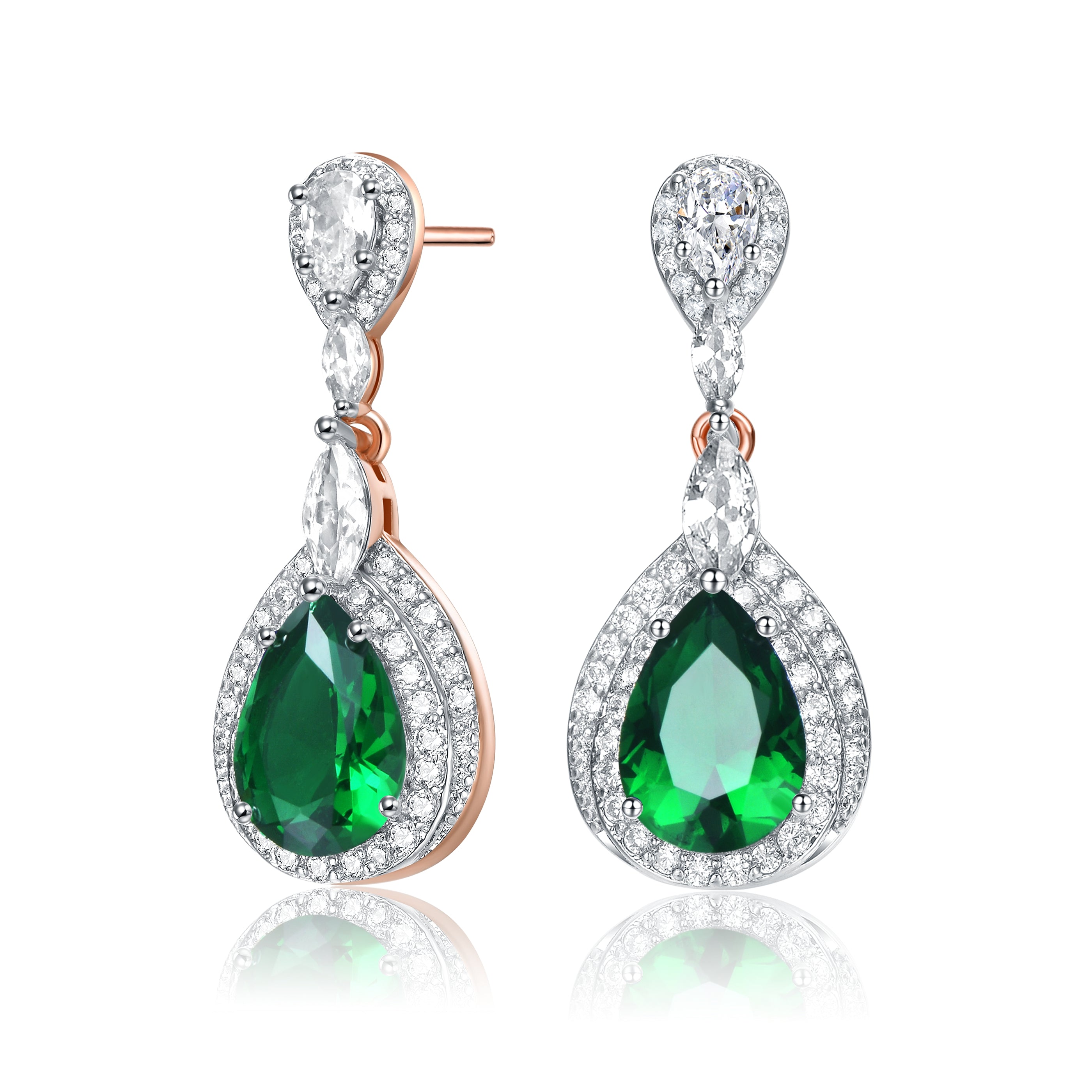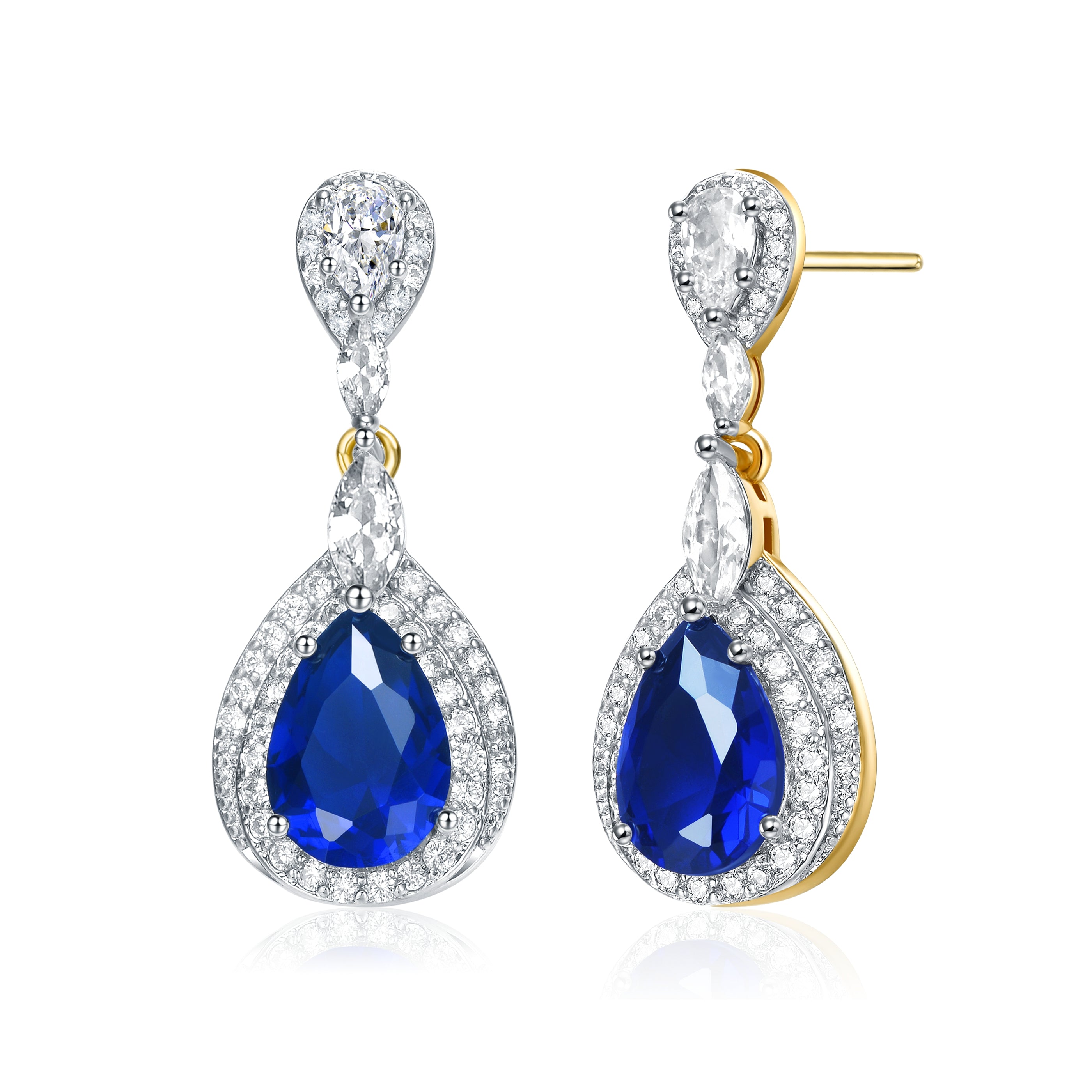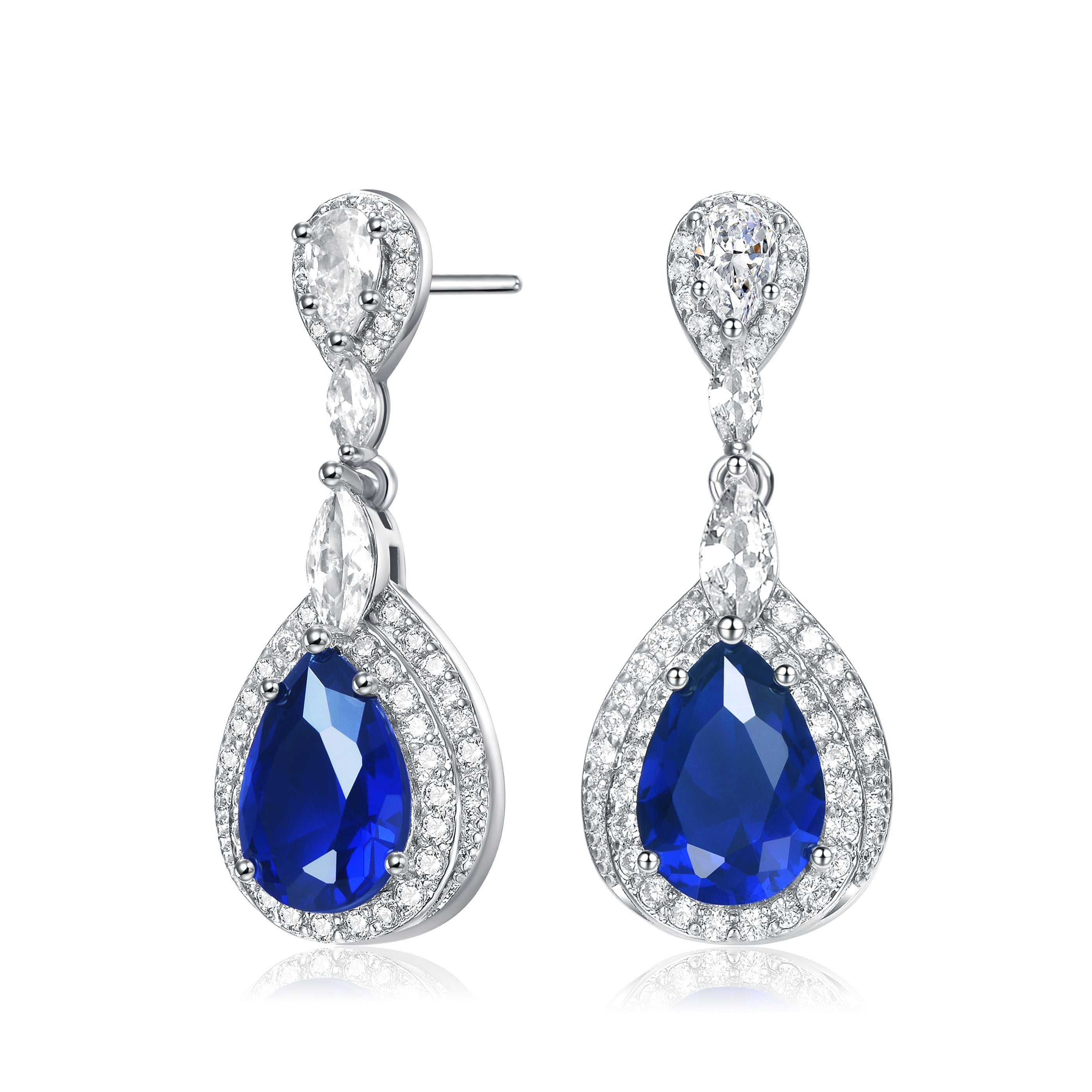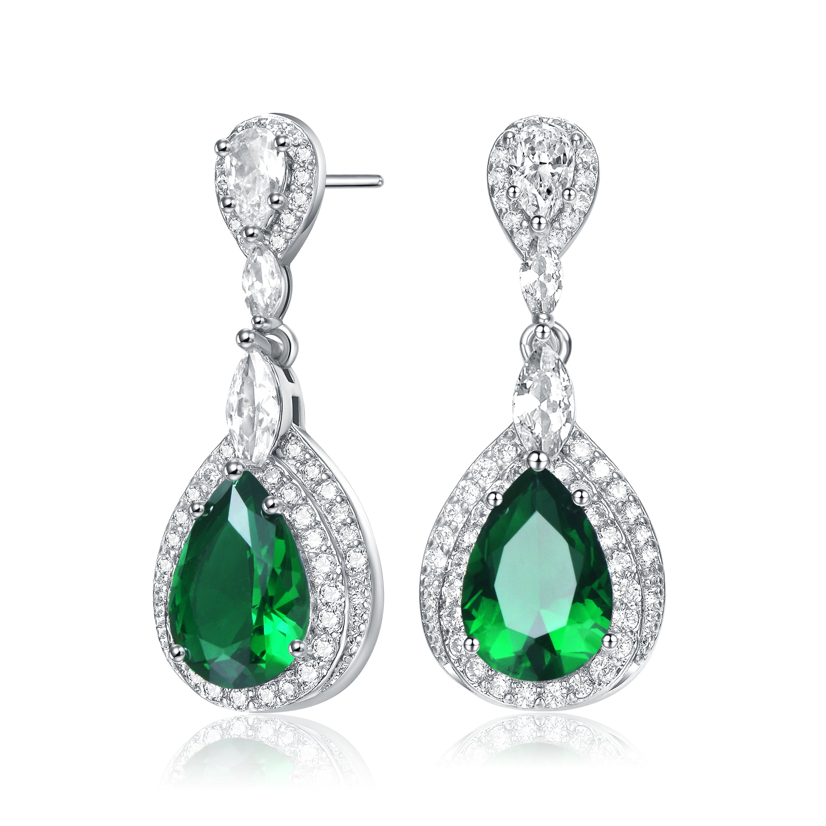 Elegant and simple earrings feature clear pear Cubic Zirconia with clear round Cubic Zirconia double halo and accentuated with clear marquise Cubic Zirconia. These earrings are set with Rhodium plated and secures with butterfly clasp. Add an additional style to your look everytime you wear these earrings.