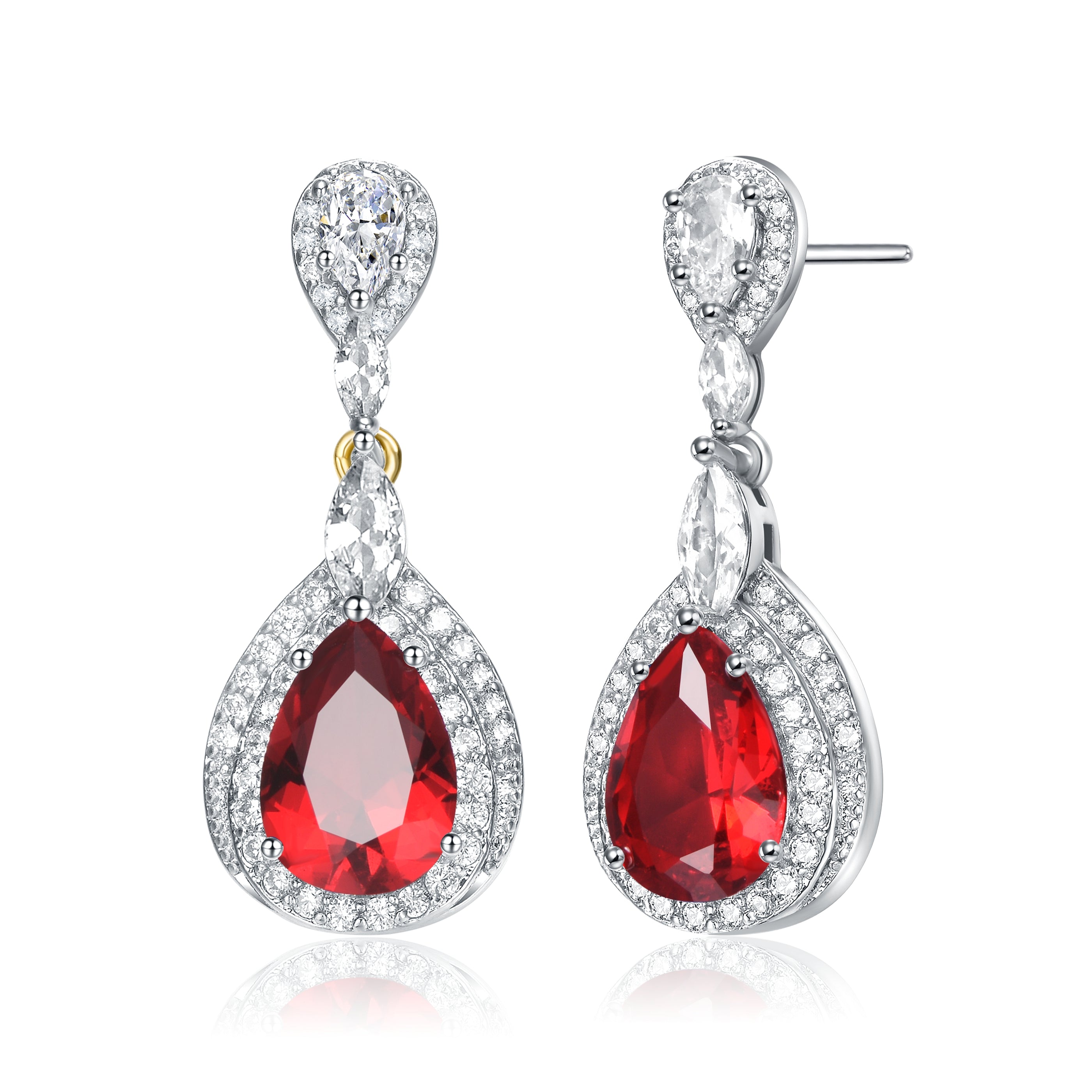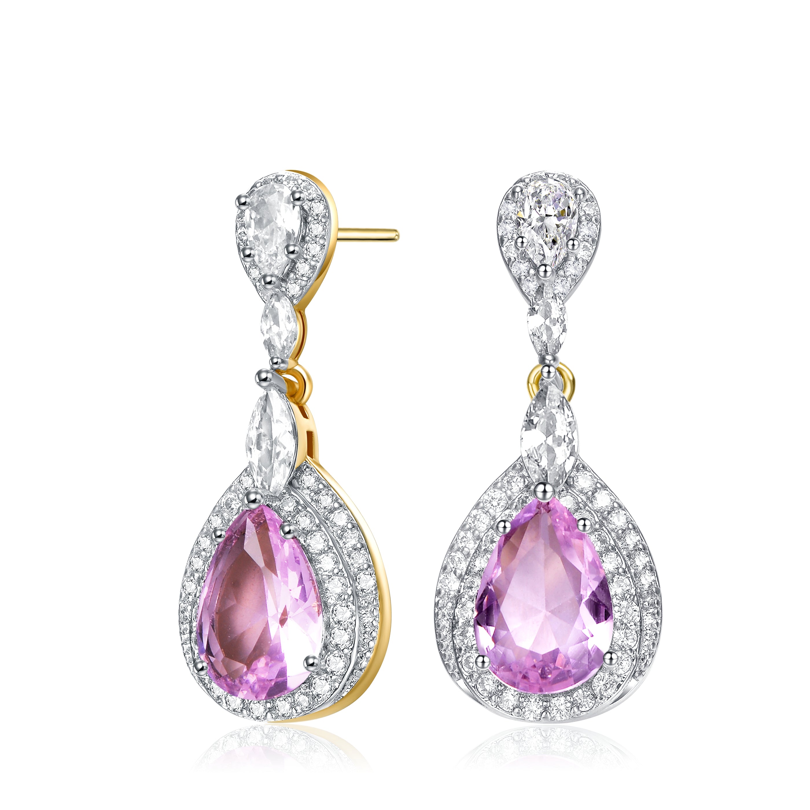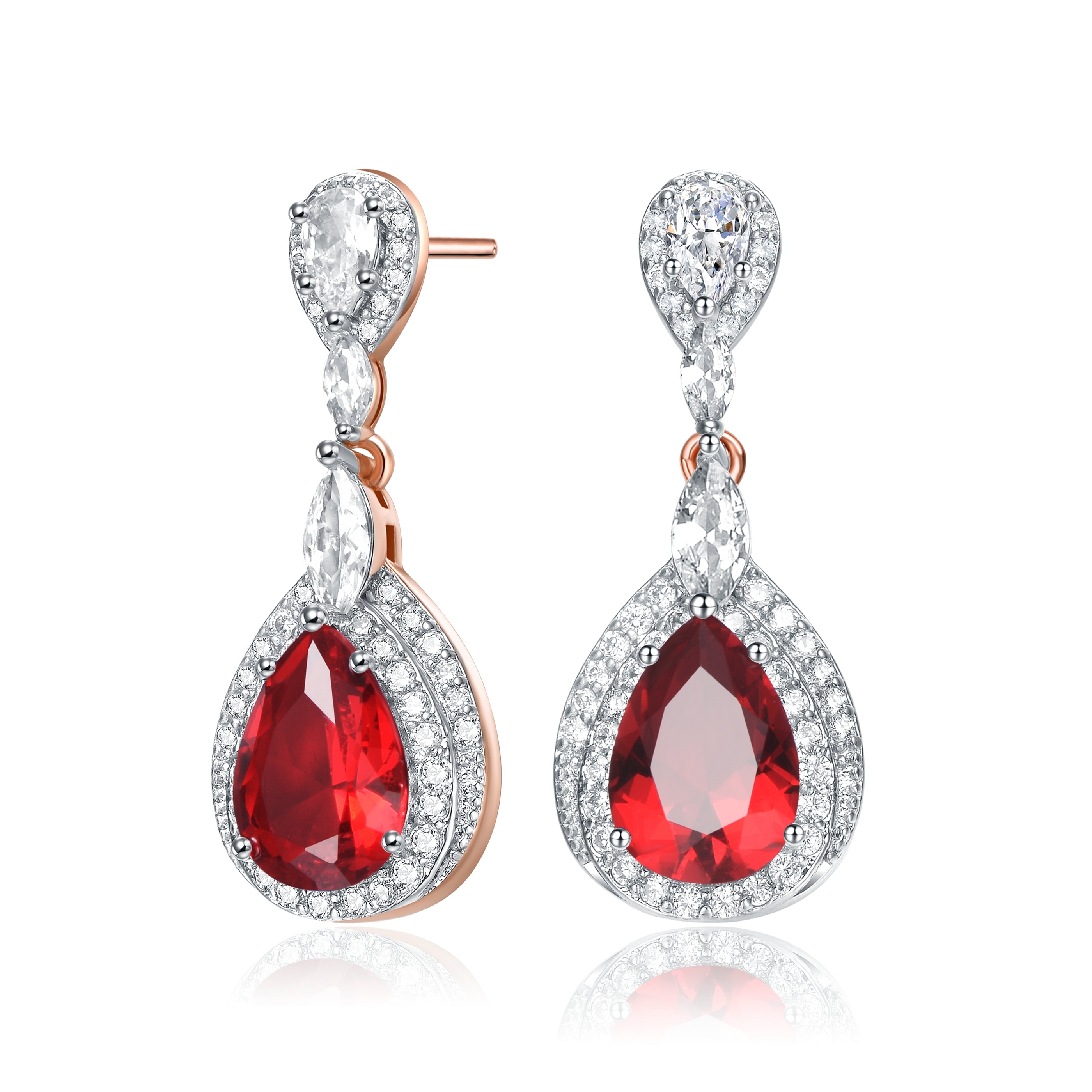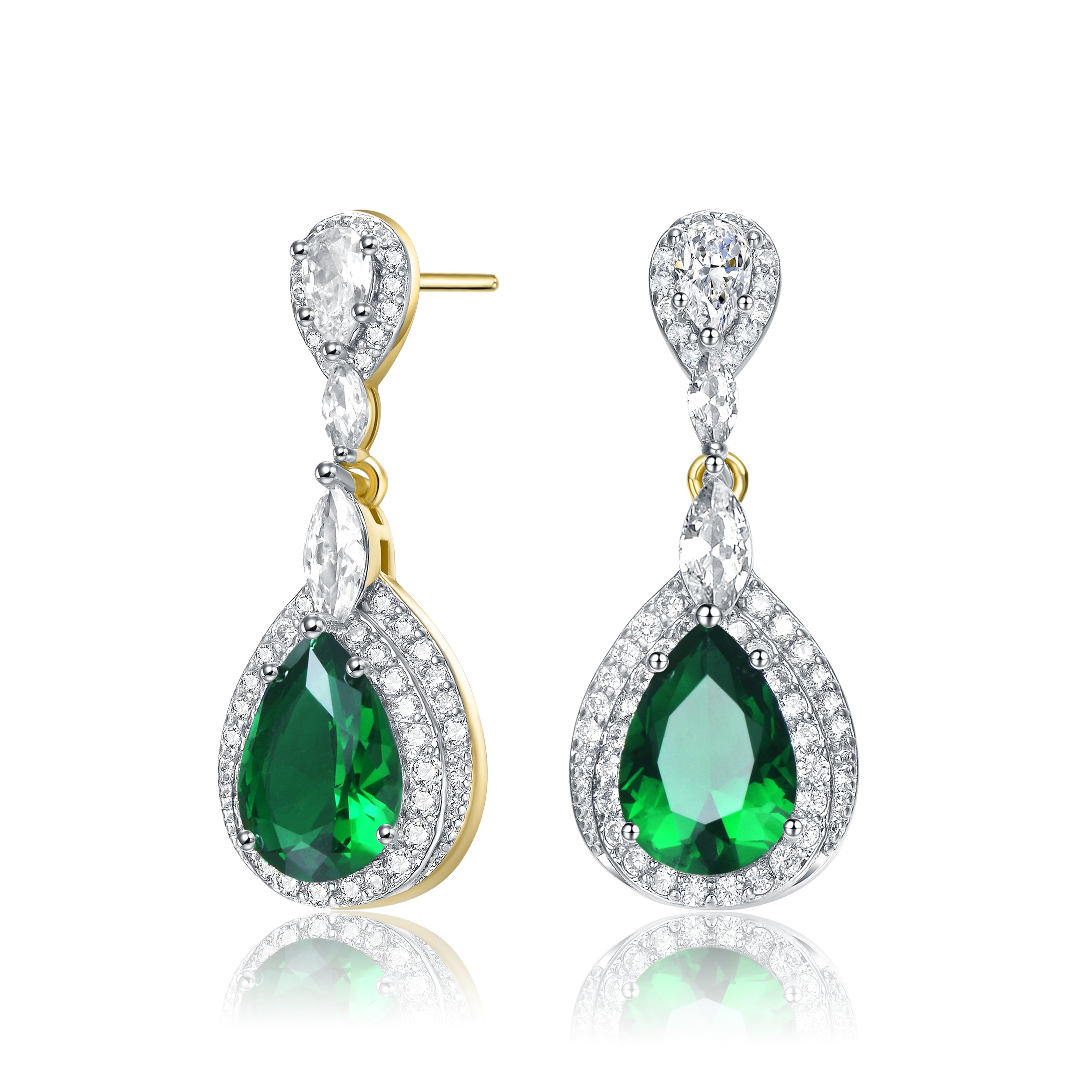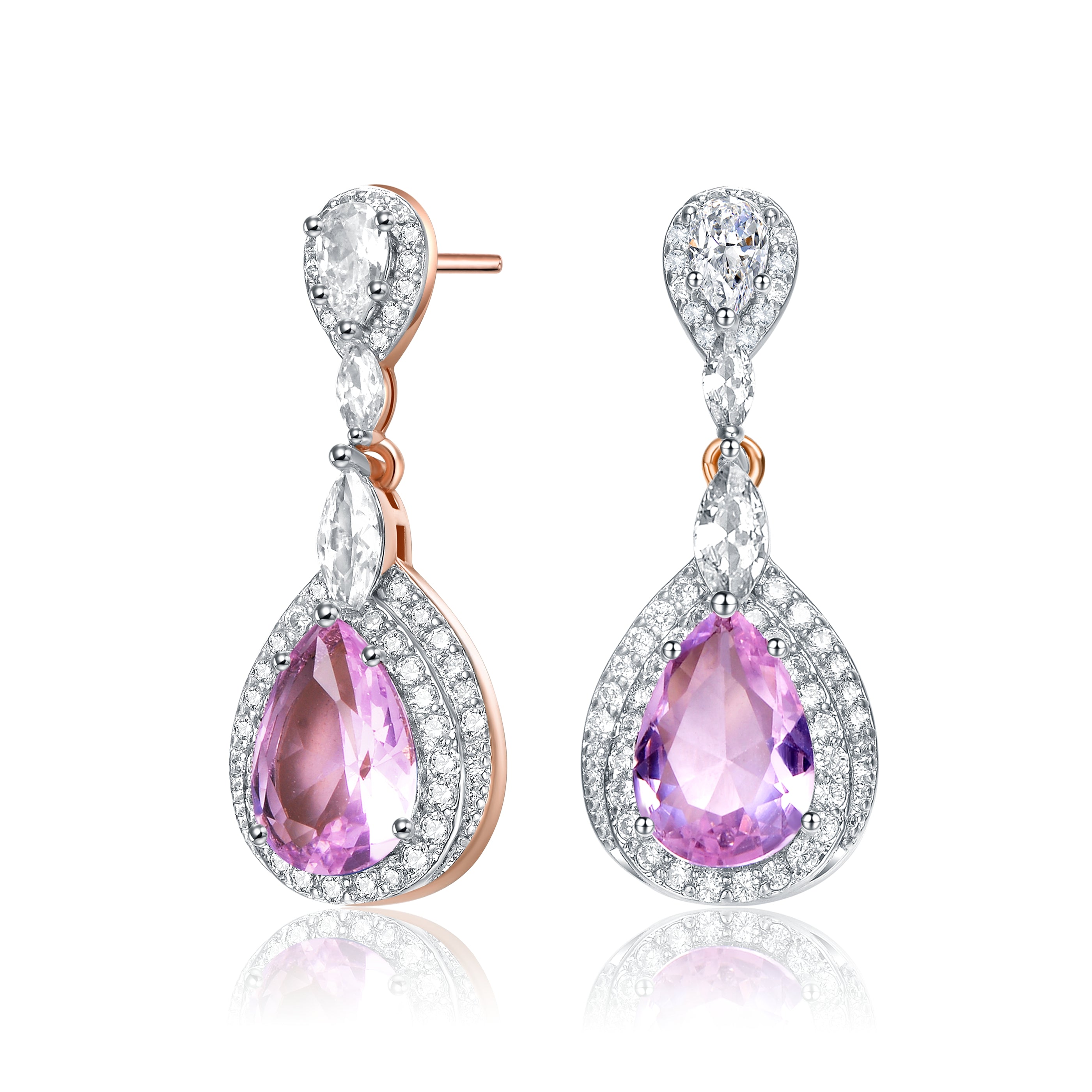 Elegant and simple earrings feature clear pear Cubic Zirconia with clear round Cubic Zirconia double halo and accentuated with clear marquise Cubic Zirconia. These earrings are set with Rhodium plated and secures with butterfly clasp. Add an additional style to your look everytime you wear these earrings.
