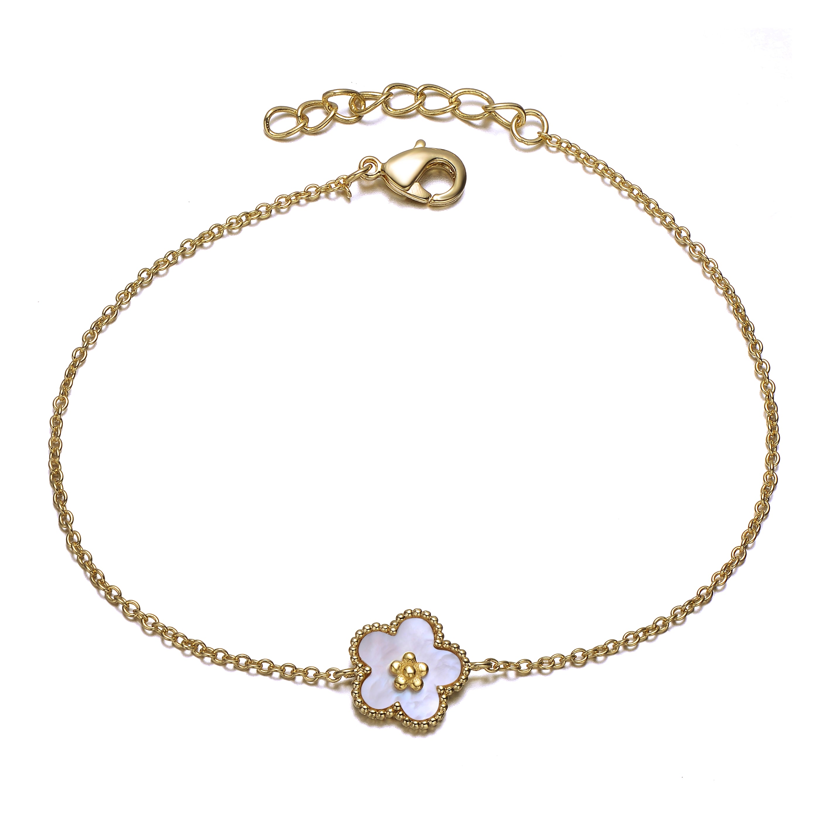 This elegant 5+1 inch 14k gold plated chain bracelet is perfect for girls and teens. It features a stunning flower charm at the center with a mother of pearl white interior, encased by a gold pearl outer frame. Adding a touch of sparkle, a small cubic zirconia is delicately placed on top of the flower, held securely by five prongs. The bracelet is finished with a lobster clasp for adjustable and secure wear. An exquisite accessory for any special occasion, it is perfect for graduations, holidays, birthdays, and vacations.