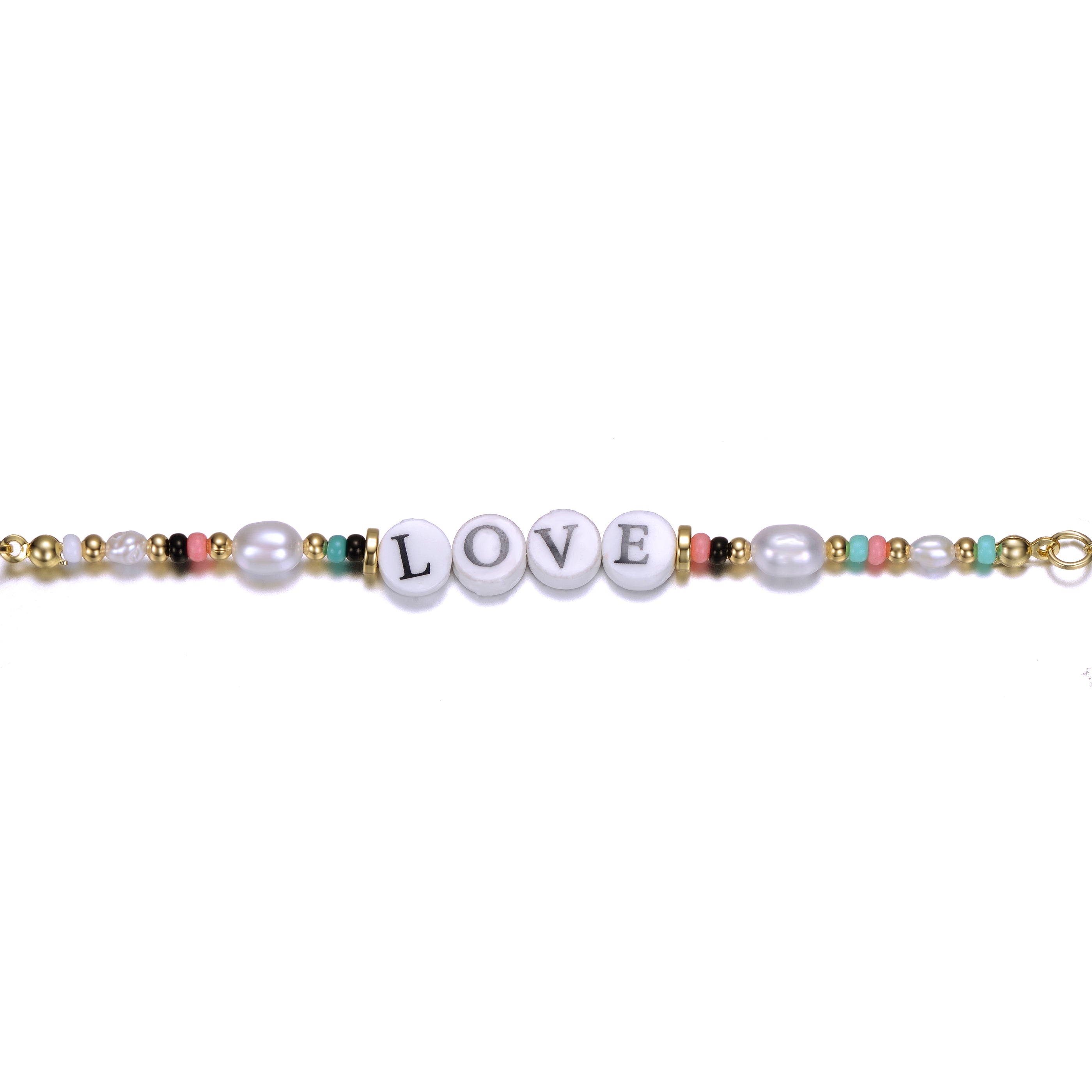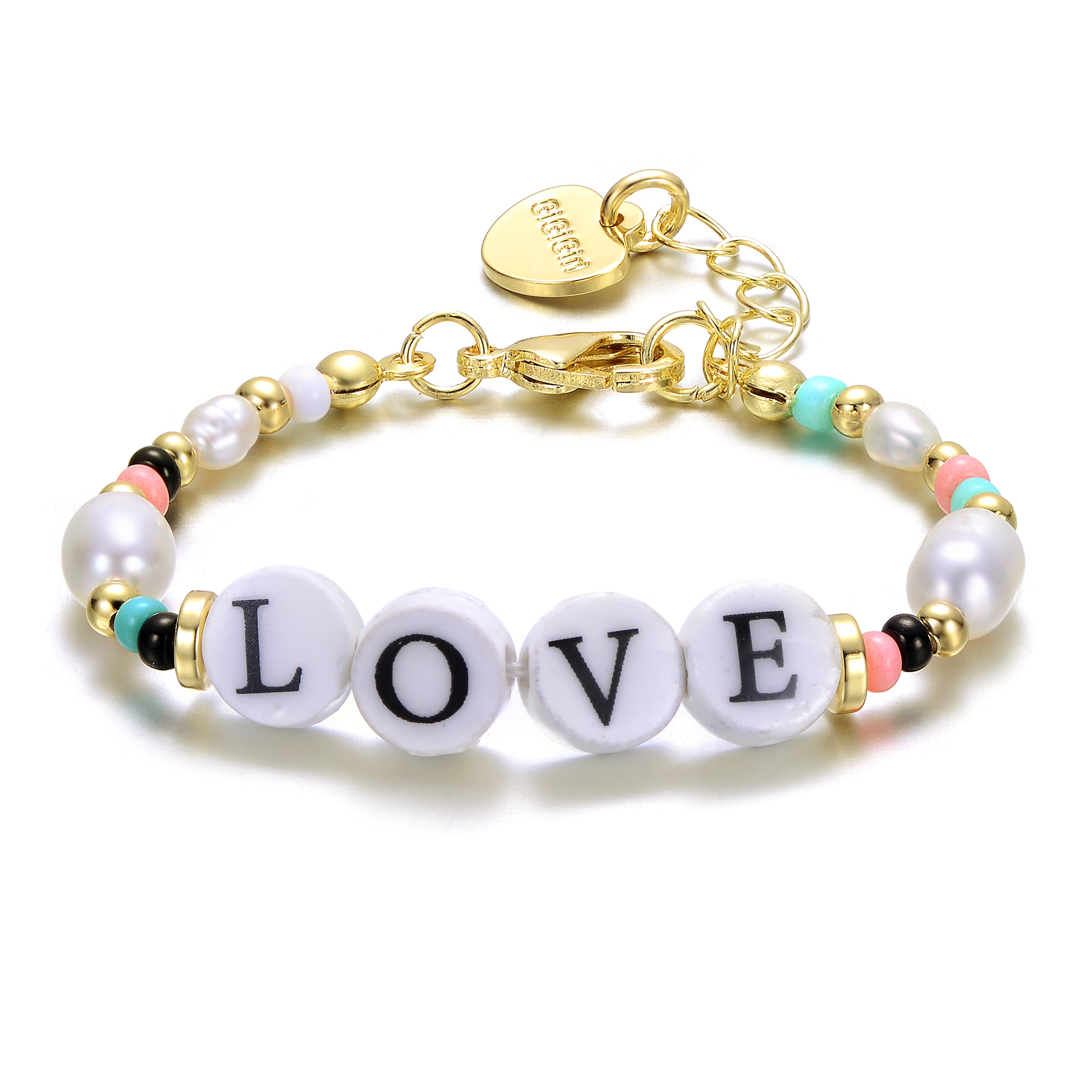 Show your kid some love with this charming bracelet. It features multi-color beads, freshwater pearls, and a love tag in circular charms, all plated in 14k gold. The lobster clasp ensures a snug and comfortable fit. This bracelet is a wonderful gift for any occasion or a delightful treat for yourself.