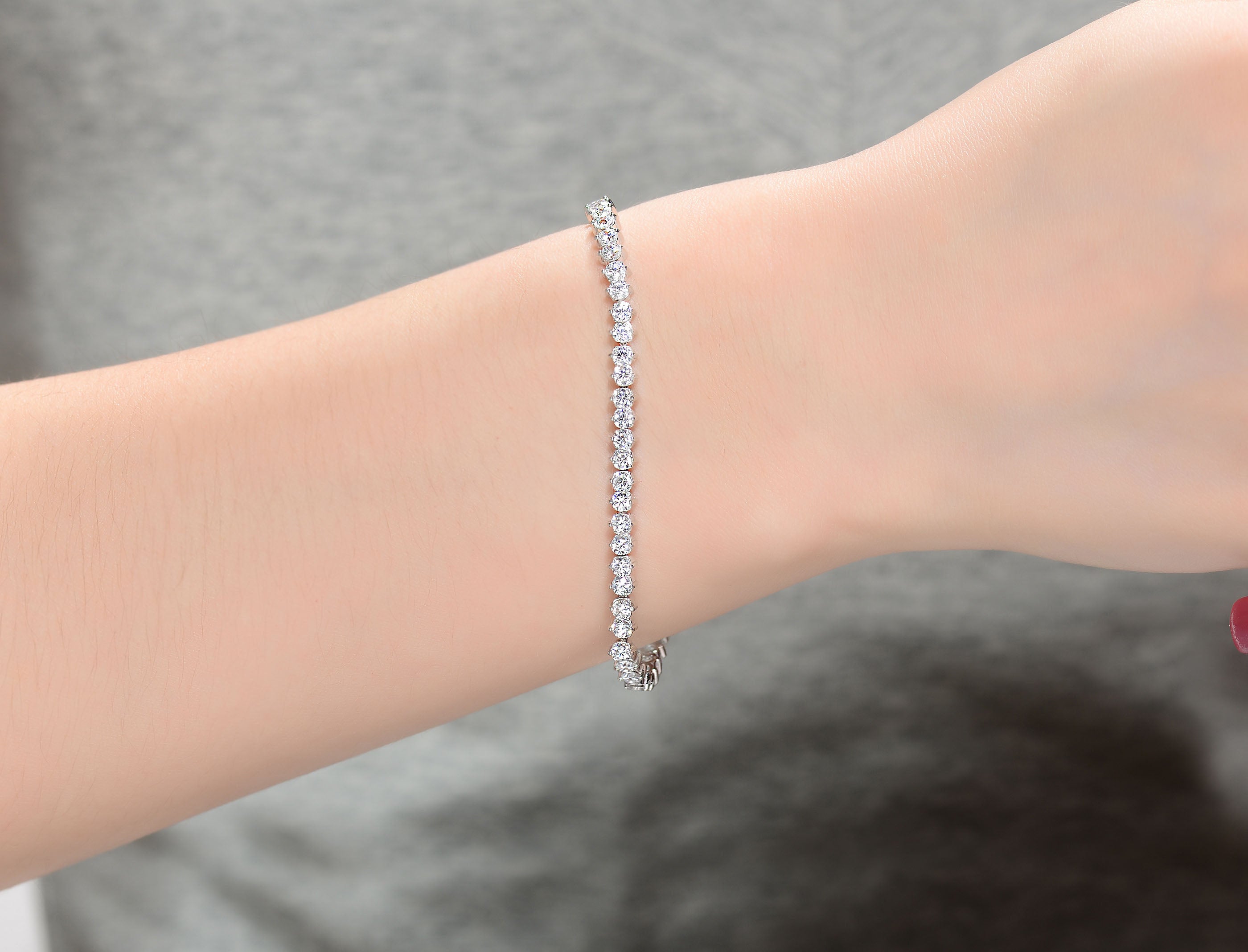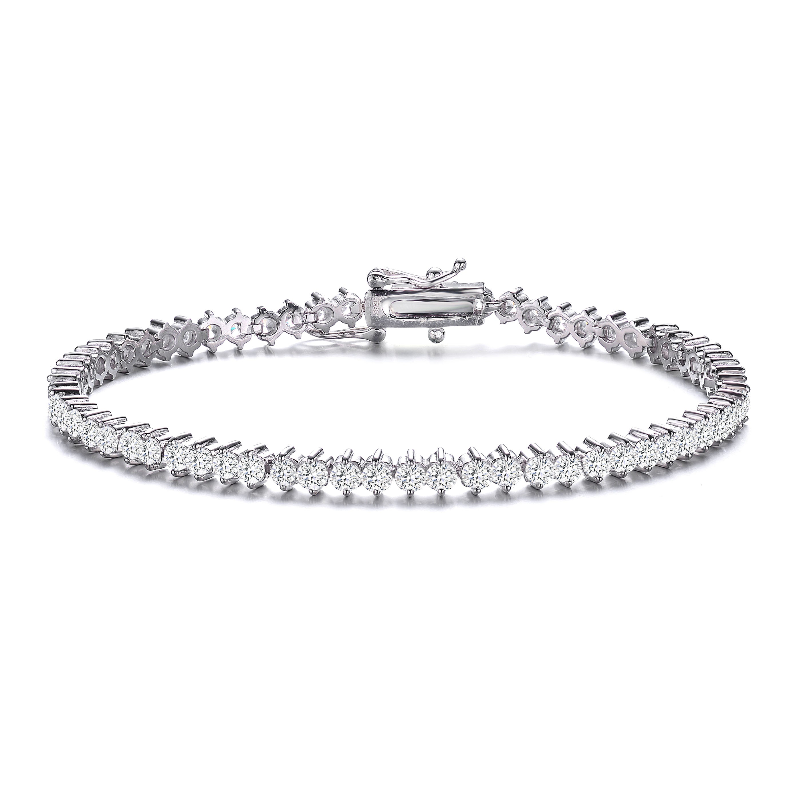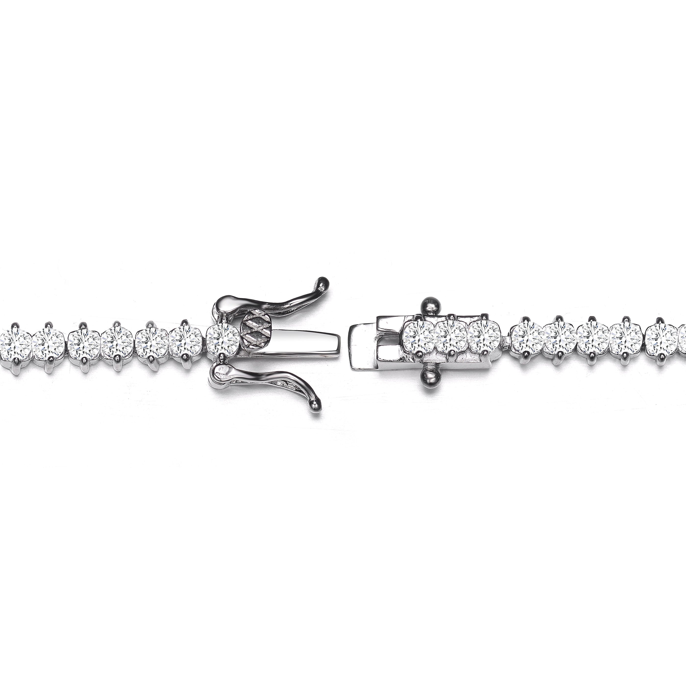 This sophisticated tennis bracelet features a single row of sparkling cubic zirconia stones, each meticulously set in a rhodium-plated band. The bracelet is secured with a sturdy clasp, ensuring both safety and comfort for the wearer. Its classic design exudes timeless elegance, making it an ideal accessory for both formal occasions and everyday wear. The rhodium plating not only adds a lustrous finish but also enhances durability, resisting tarnish to maintain its gleaming appearance over time.