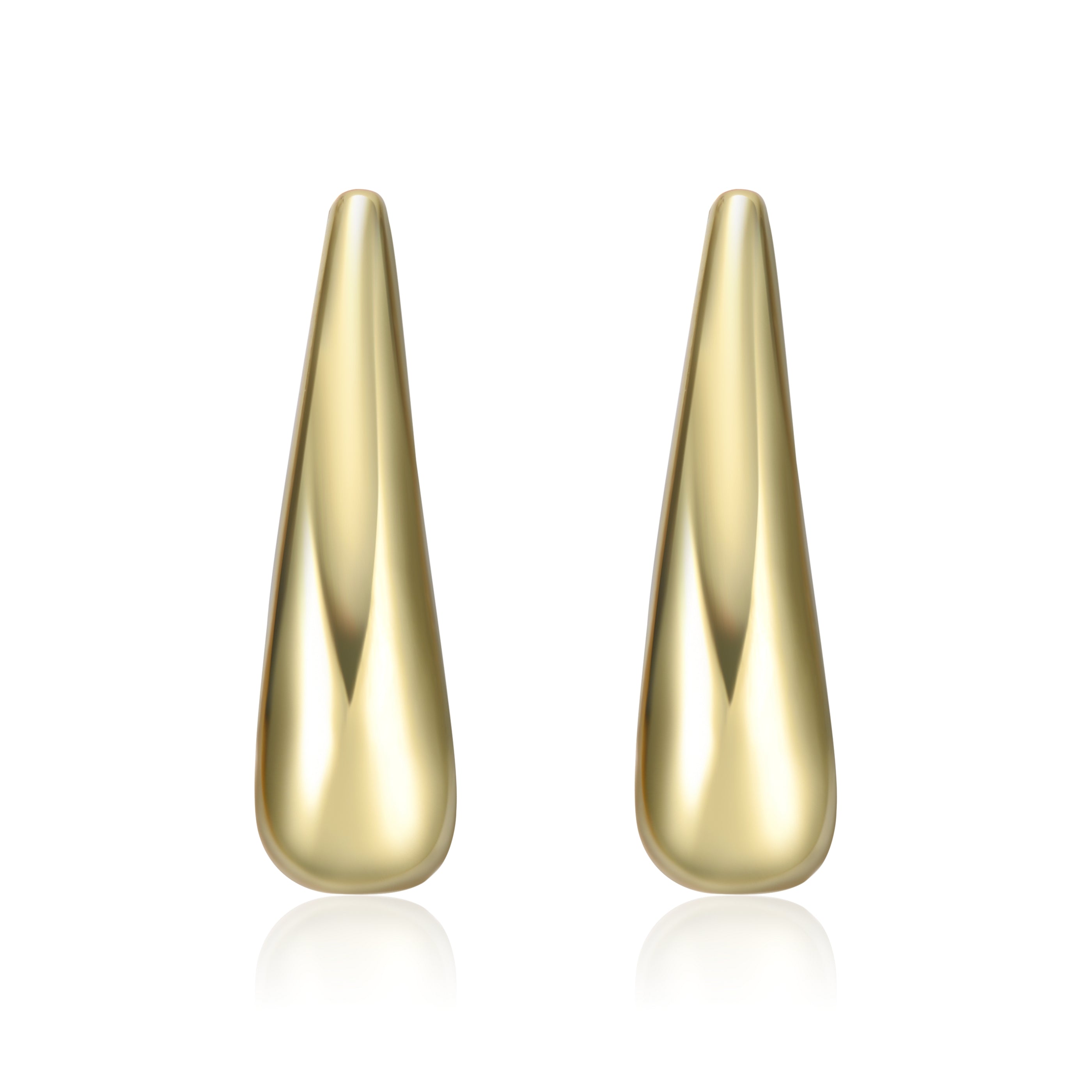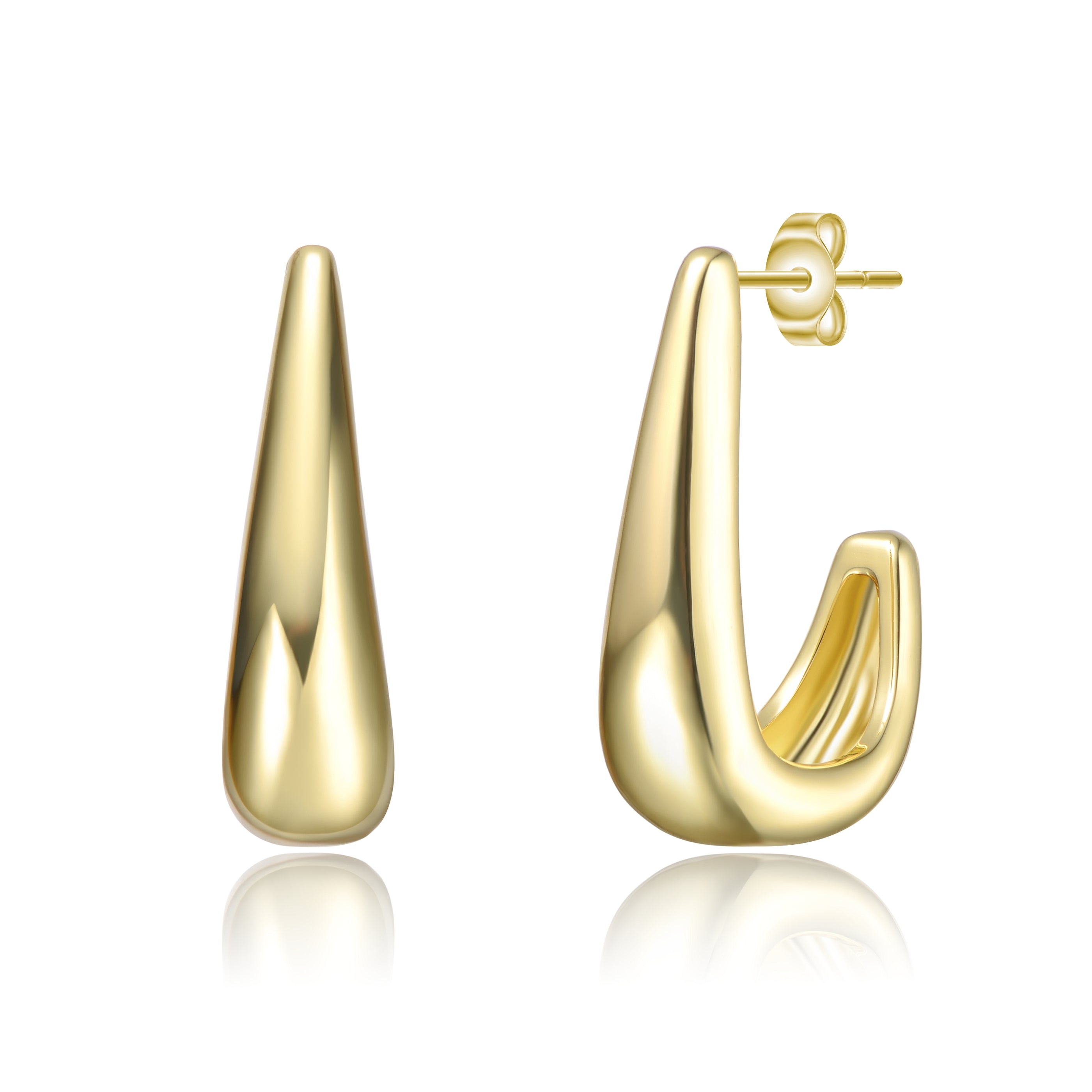 14k Gold Plated Bright Shine J-Hoop Earrings. Reinvent your wardrobe with a pair of earrings that can go anywhere you do with their effortlessly elegant style. These brightly polished 14k gold plated drop earrings are fashioned into the classic "J" silhouette, amplified by the tapered width from bottom to top--which also offers comfort to this pretty design. Butterfly backs keep these earrings in place, making them your next favorite go-to for any time.