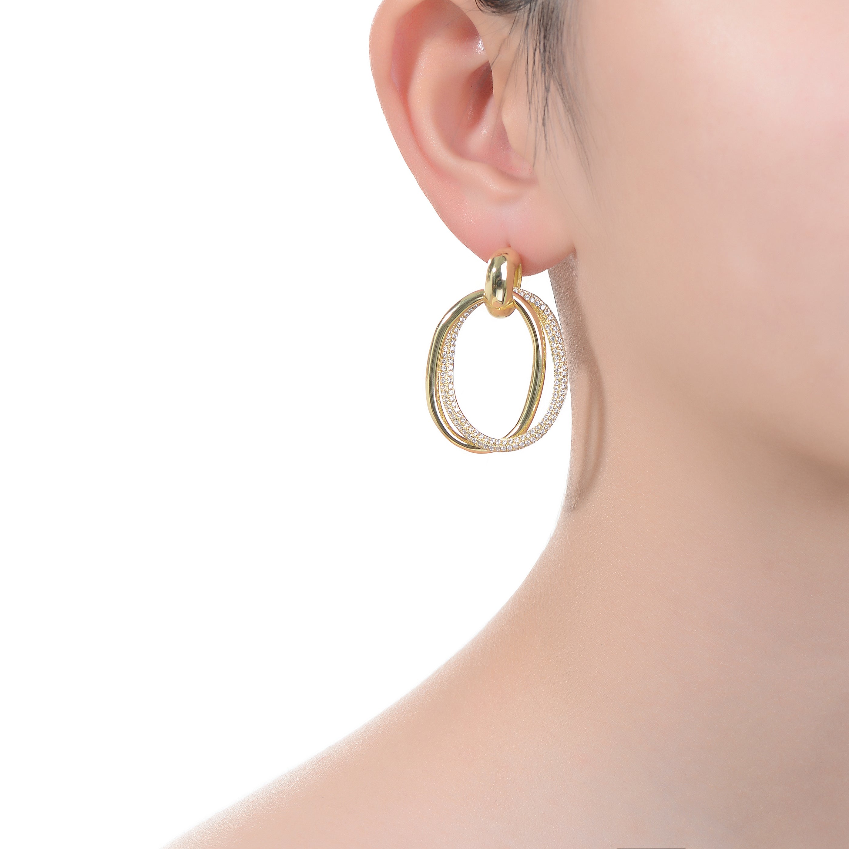 Classy 14K Gold Plated Cubic Zirconia Stud Earrings. These earrings feature a classy design made out two assymetrical pieces intertwined between: one large rounded shaped piece made out of solid metal and the other large rounded shape accented with small clear round cubic zicronia stones paved on the frame. Both pieces are grouped at the top where it continues to the post. Crafted with 14K Gold Plating and it is secured with butterfly closure. Perfect piece of jewelry for stylish combinations. This also makes a sensational gift for a special birthday or occasion.