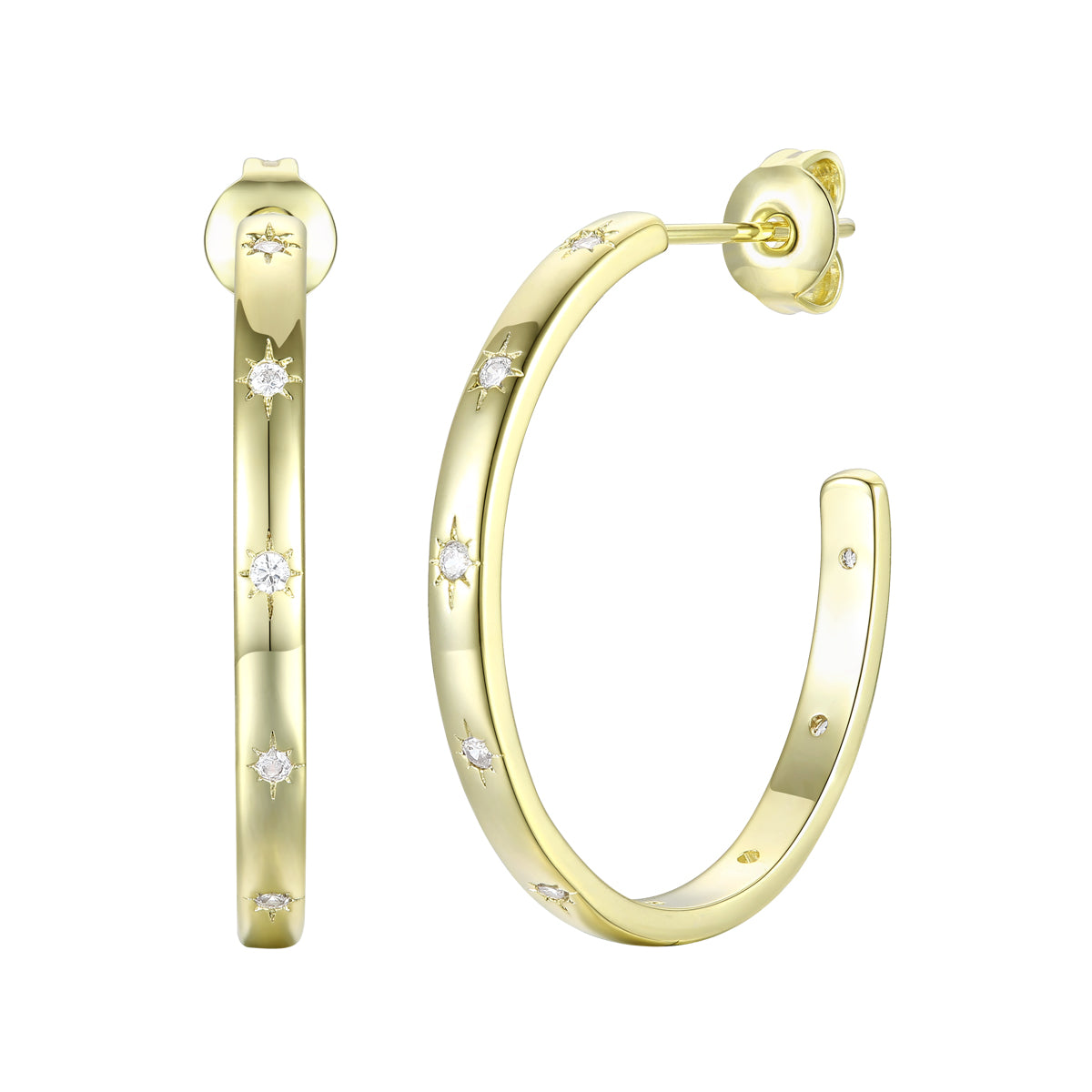 Classy 14K Gold Plated Cubic Zirconia Hoop Earrings. These Hoop earrings feature interesting hoop design, that is made out of hoops with star engraved structure and one clear round cubic zirconia stone in the star, artfully crafted, making the perfect hoop. Crafted with 14K Gold Plating and secure with a butterfly closure. Perfect piece of jewelry for all combinations. These also make a sensational gift for a special birthday or occasion.